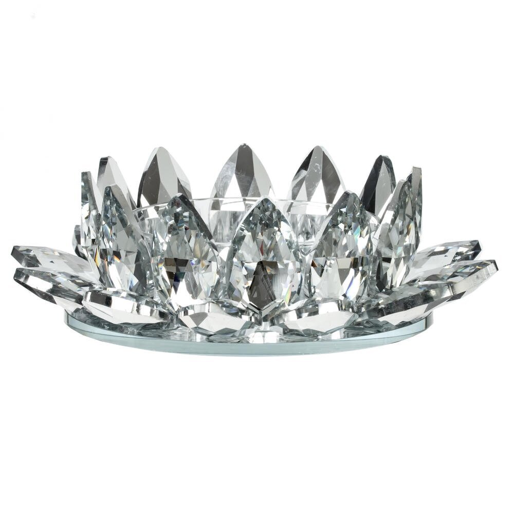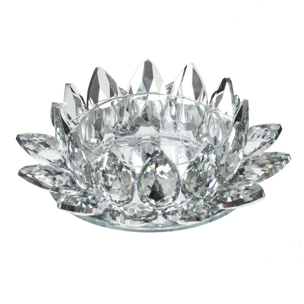 Изысканный стеклянный подсвечник в форме раскрытого цветка станет ярким акцентом любого интерьера. Прозрачные гранёные лепестки создают эффект кристалла и красиво преломляют свет, наполняя комнату мягким мерцанием. Подсвечник гармонично смотрится на праздничном столе, каминной полке, туалетном столике или в спа?зоне. Подходит для романтических вечеров, сервировки торжеств и создания уютной атмосферы в повседневной жизни. Отличный вариант подарка ценителям стильного и утончённого декора. Для свечи, диаметром 7,5 см.