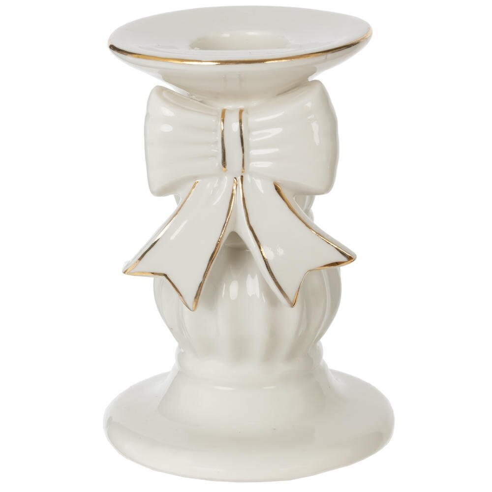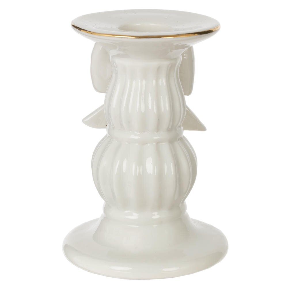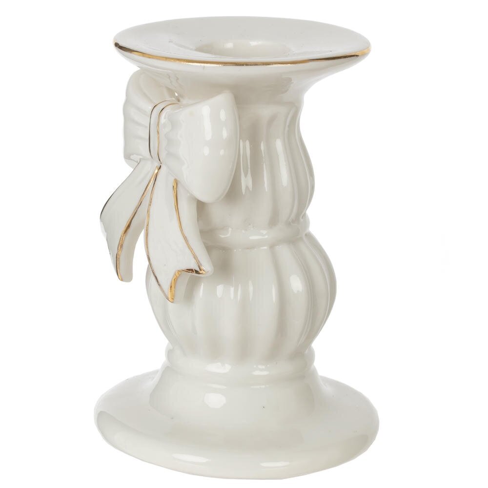 Изысканный подсвечник из белого фарфора — это элегантный элемент декора, который придаст вашему интерьеру утонченность и уют. Украшенный аккуратным бантом и декорированный изящными золотыми деталями, он смотрится особенно нарядно и празднично. Белый фарфор придаёт изделию легкость и чистоту, а золотой декор добавляет благородства и торжественности. Такой подсвечник идеально подойдёт для украшения праздничного стола, камина, полки или подоконника, создавая мягкое и уютное освещение. Он гармонично впишется как в классический, так и в современный интерьер, став акцентной деталью вашей новогодней или повседневной композиции. Подсвечник также может стать прекрасным подарком для ценителей утончённого стиля и изысканных аксессуаров. Его изящество и качество исполнения делают его не просто функциональным предметом, а настоящим произведением искусства.