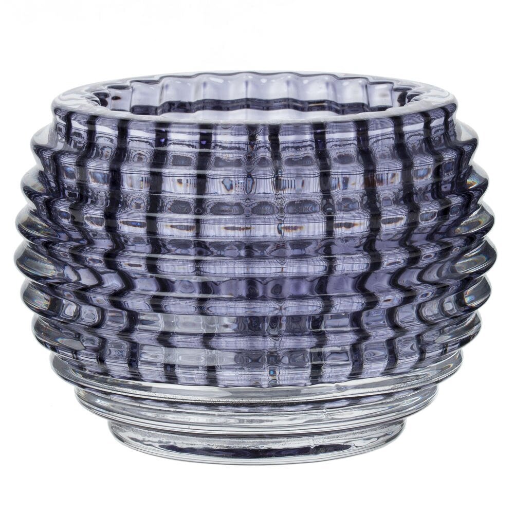 Стеклянный подсвечник округлой формы с выраженным рельефом: по всей поверхности идут плотные горизонтальные ребра, создающие эффект волнообразных колец. Стекло густо окрашено в серый цвет, к основанию плавно переходит в прозрачное, благодаря чему при зажигании свечи свет преломляется и дает теплые блики и полосатые тени. Широкое горло удобно для чайной свечи или небольшой вотивной. Толстые стенки и тяжелое, устойчивое дно повышают безопасность и удерживают тепло. Глянцевая поверхность легко очищается. Подсвечник станет ярким акцентом на столе, полке или подоконнике, добавит уют в современный интерьер и уместен как праздничное оформление или романтический декор. Для свечи, диаметром 5 см.