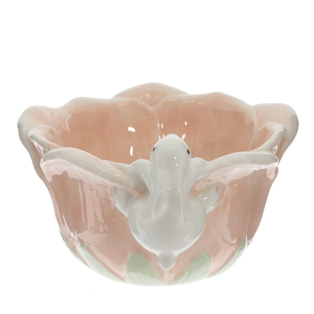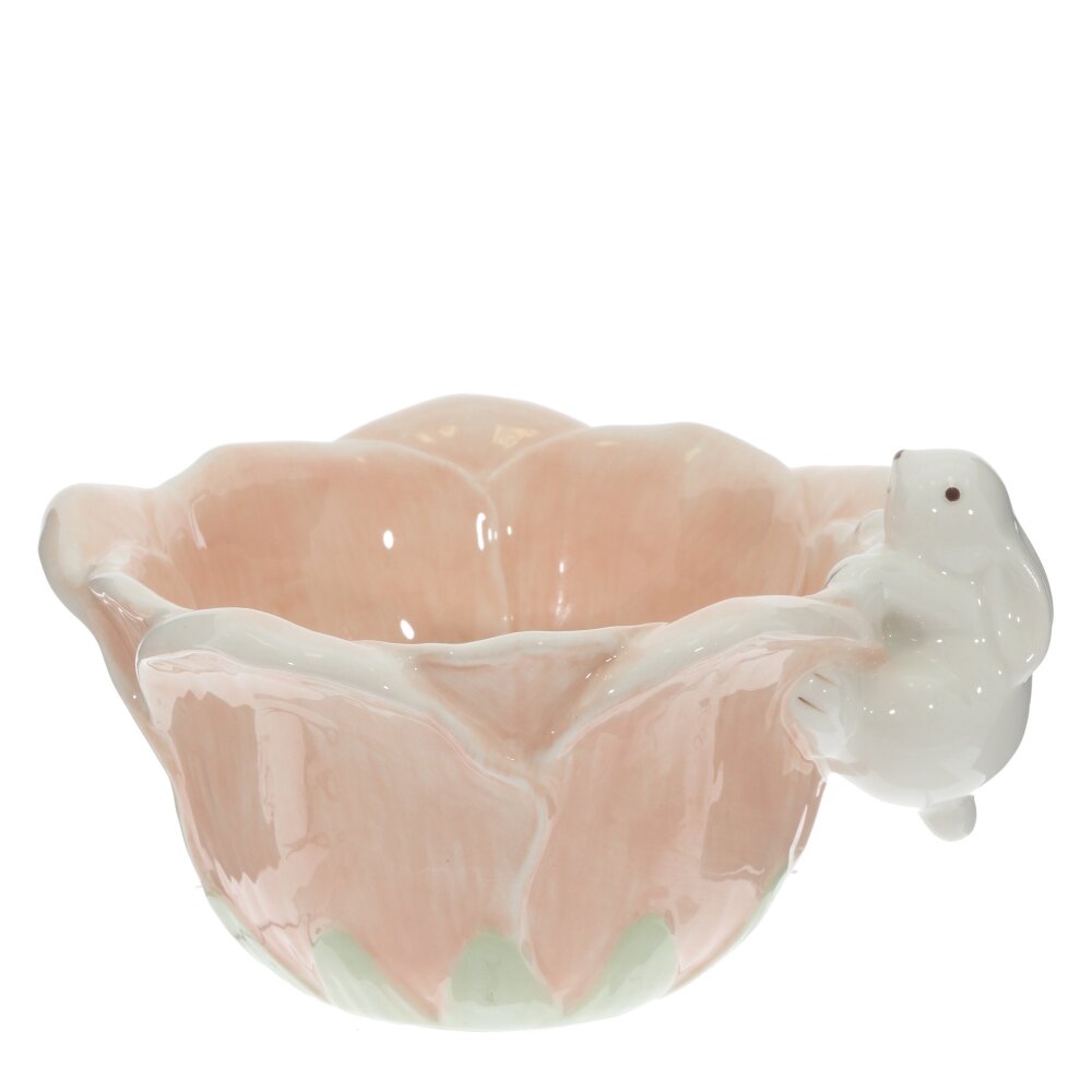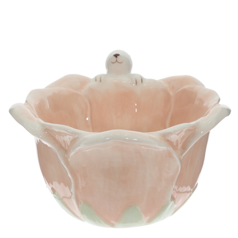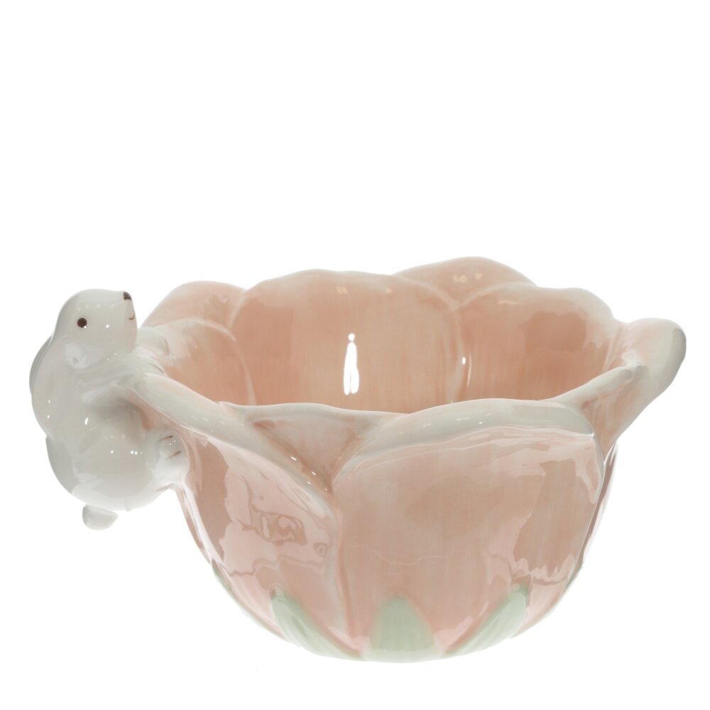 Нежный пасхальный салатник из керамики объёмом 290 мл станет милым акцентом вашего праздничного стола. Чаша выполнена в форме раскрытого цветка нежно-розового оттенка с глянцевой глазурью, а на краю расположился забавный белый кролик – традиционный символ Пасхи. Идеально подходит для порционной подачи салатов, орешков, конфет, сухофруктов или небольших десертов. Прочный материал легко моется и сохраняет яркость красок, создавая атмосферу уюта и весеннего настроения в доме.