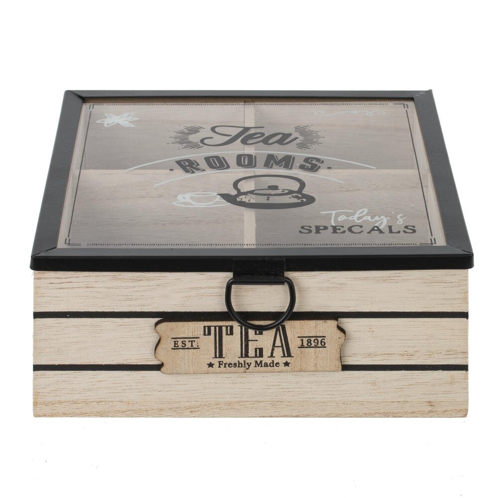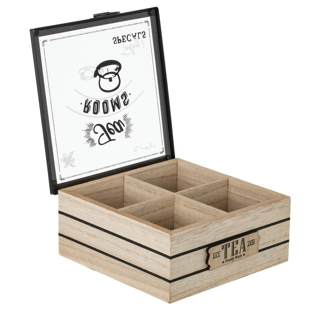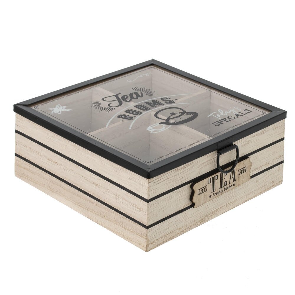Элегантная шкатулка для чайных пакетиков, выполненная из натурального дерева со стеклянной крышкой и металлической фурнитурой. Прозрачное стекло с декоративным принтом позволяет видеть содержимое и легко находить нужный сорт чая, не открывая коробку. Внутри предусмотрены разделённые секции для аккуратного хранения различных вкусов. Корпус в светлых древесных тонах с контрастными полосами и винтажной надписью «Tea» на передней панели придаёт изделию стильный ретро?характер. Металлическая ручка облегчает открывание крышки и служит дополнительным декоративным акцентом. Такая шкатулка станет практичным аксессуаром на кухне, украсит чайный стол и подойдёт в качестве оригинального подарка любителям чая.