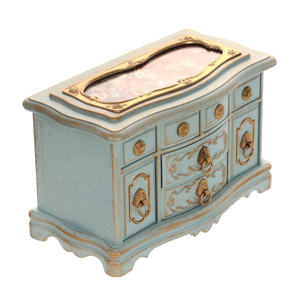 Перед вами изящная музыкальная шкатулка для украшений, выполненная в винтажном стиле. Основной материал корпуса – полимерные материалы, которые удачно имитируют старинное дерево с потертостями. Крышка шкатулки снабжена зеркалом, что удобно для примерки украшений. Внутри предусмотрены отдельные секции для хранения колец, браслетов и других драгоценностей. Особую атмосферу создаёт заводной музыкальный механизм: при его активации начинает звучать мелодия, а миниатюрная фигурка балерины начинает вращаться, что смотрится очень эффектно. Декоративные элементы выполнены из металла и пластика с золотистым покрытием, что придаёт шкатулке утончённый и благородный вид. Шкатулка станет не только функциональным аксессуаром для хранения украшений, но и оригинальным элементом интерьера, добавляющим уют и шарм в любой дом.