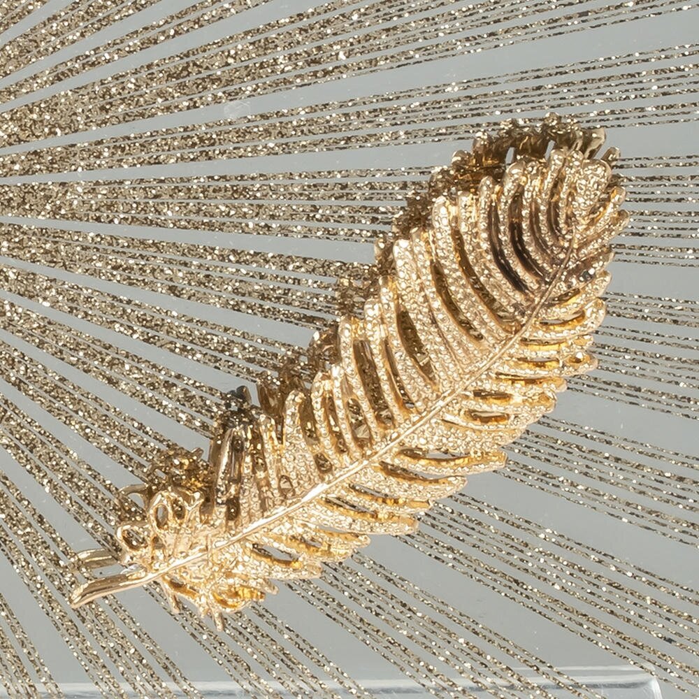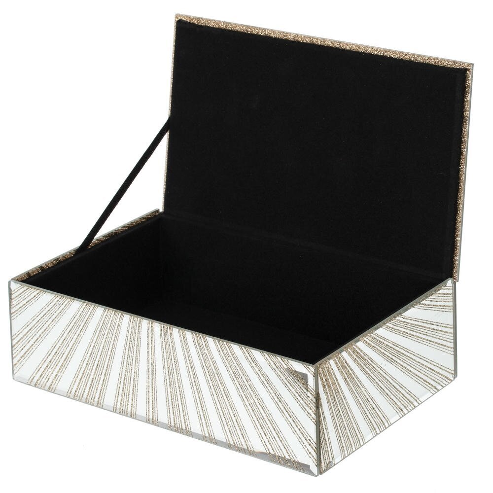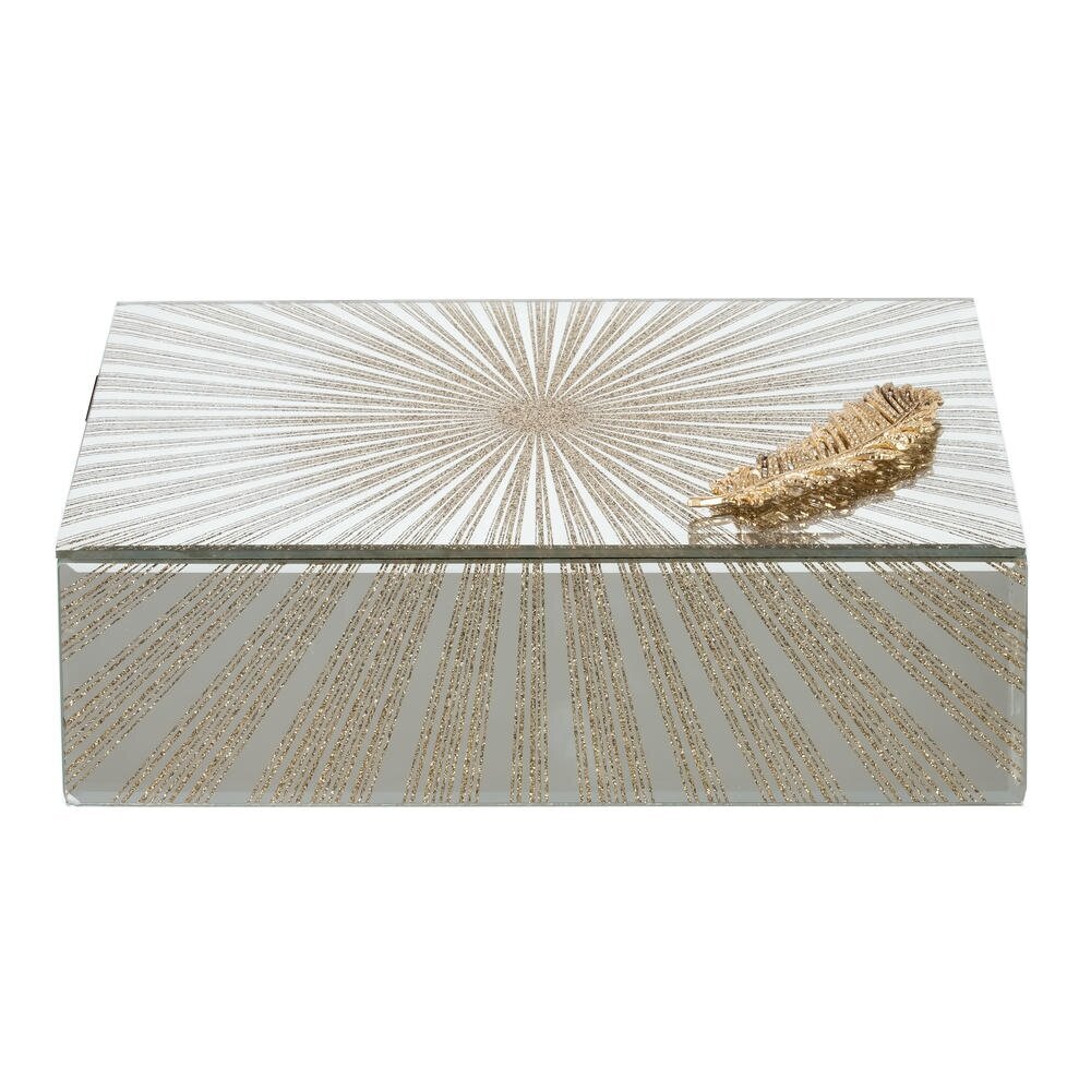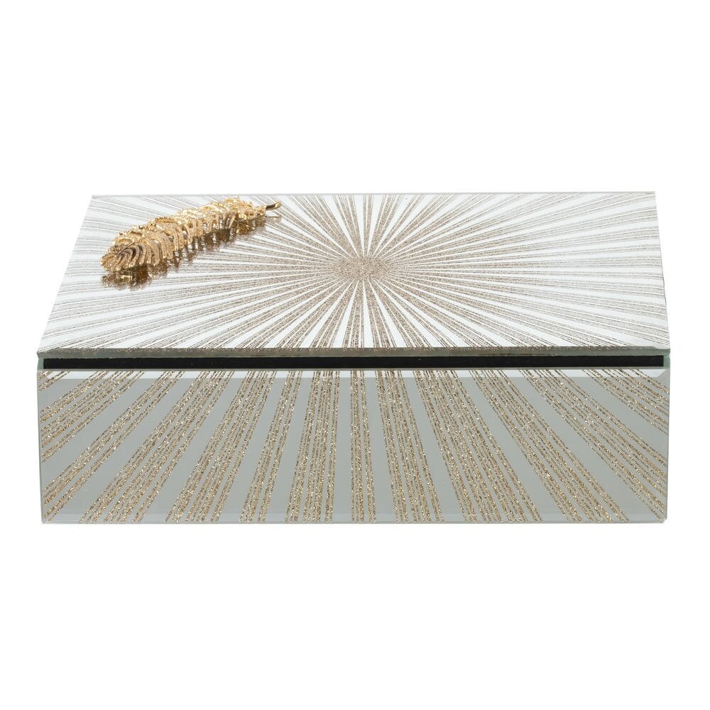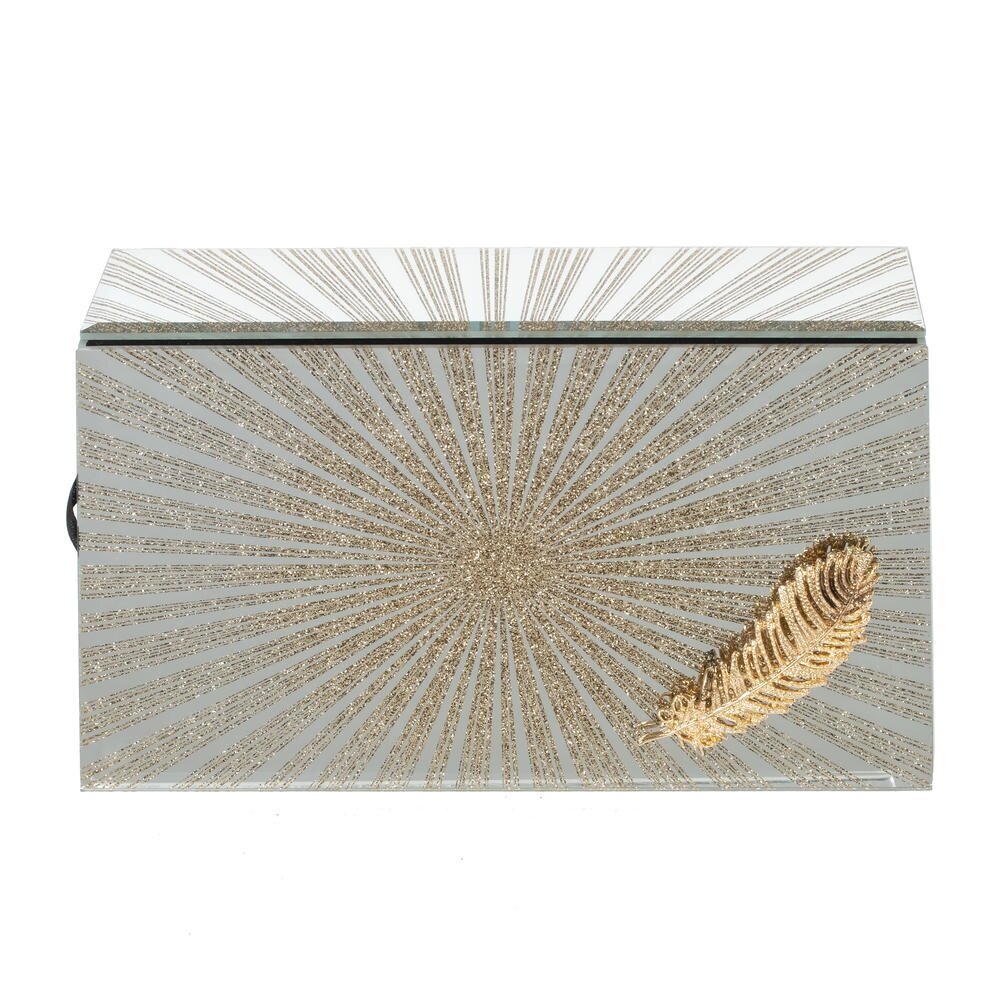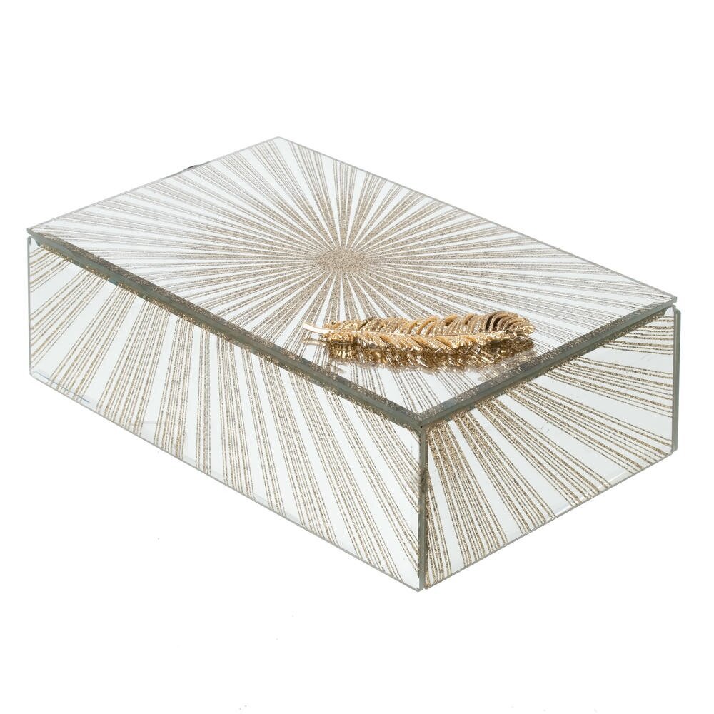 Элегантная шкатулка для хранения украшений и мелких аксессуаров. Корпус выполнен из дерева, покрытого зеркальным стеклом с эффектным лучистым узором в золотистых тонах. На крышке – декоративное золотое перо, которое придаёт изделию утончённый, слегка арт-деко характер и делает его выразительным акцентом в интерьере. Внутреннее пространство отделано мягким бархатным текстилем, который бережно защищает украшения от царапин и повреждений. Шкатулка станет не только практичным местом для хранения, но и стильным декором туалетного столика, комода или полки в гостиной. Подойдёт в качестве изысканного подарка.