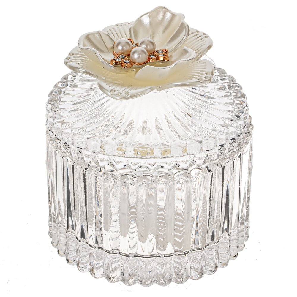 Шкатулка небольшого размера круглой формы - изящное и функциональное дополнение к вашему интерьеру. Изготовлена из качественного прозрачного стекла, что позволяет видеть хранящиеся внутри предметы. Но главная изюминка этой шкатулки - крышка , украшенная изысканным декоративным элементом из искусственного жемчуга и сверкающих стразов. Этот небольшой, но яркий акцент придает шкатулке особую изысканность и роскошь. В этой шкатулке можно хранить мелкие украшения, бижутерию, монеты или любимые мелочи - все, что вам дорого и хотите сохранить в надежном и красивом месте. Прекрасно подойдет как подарок для ваших близких или друзей, ведь такой изысканный аксессуар всегда будет цениться и радовать глаз своего обладателя.