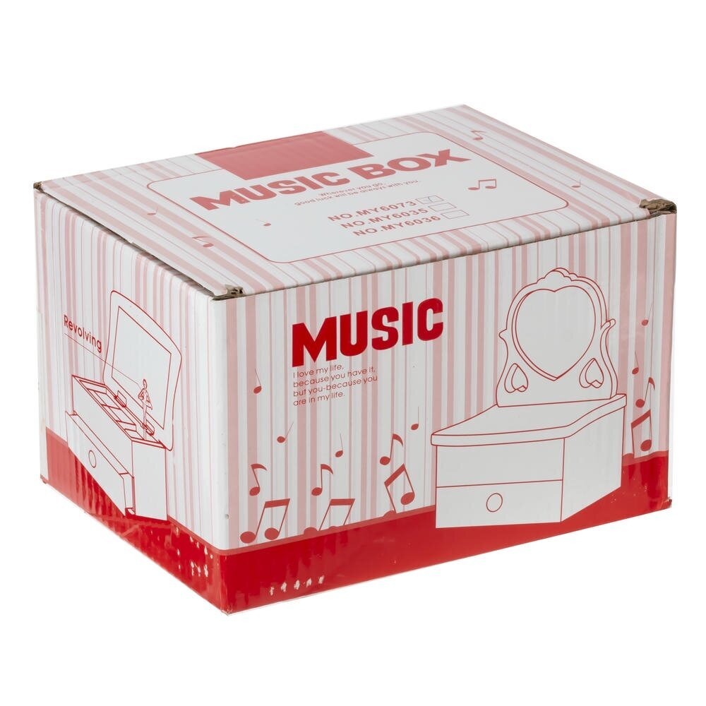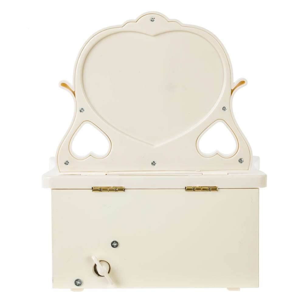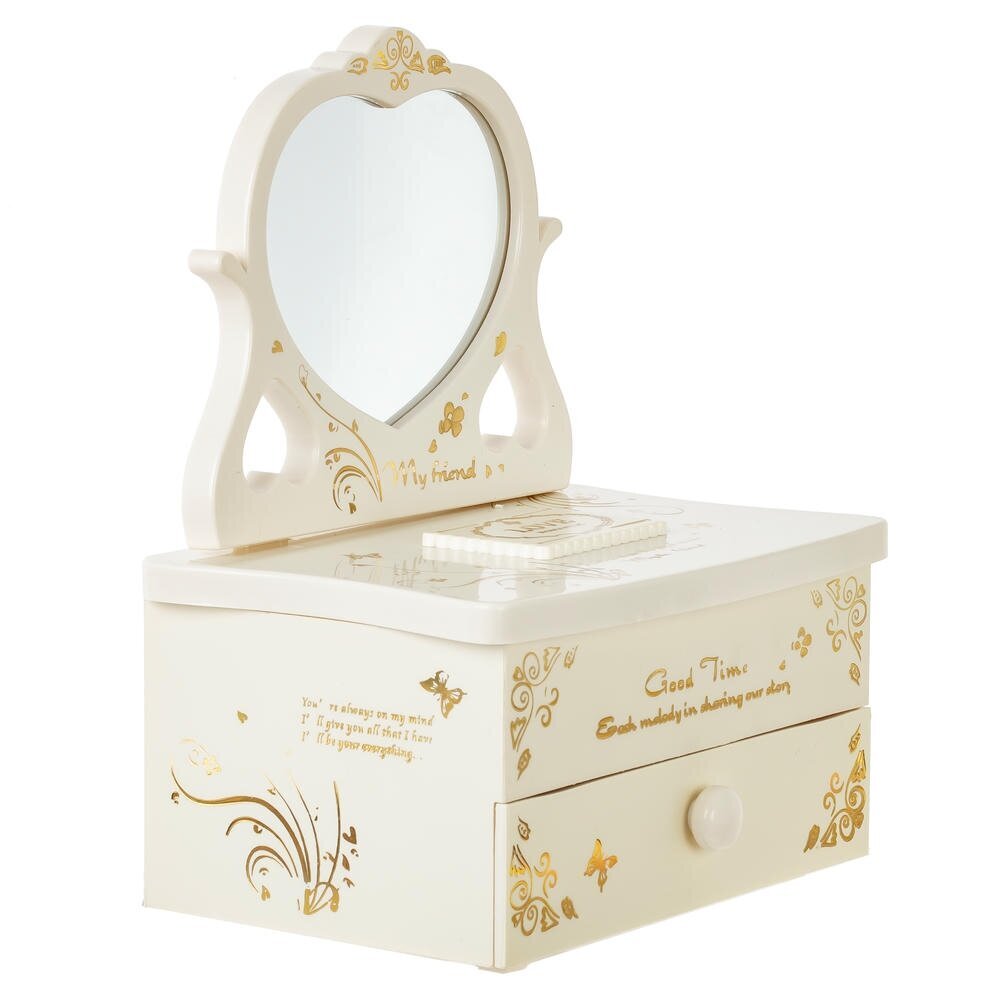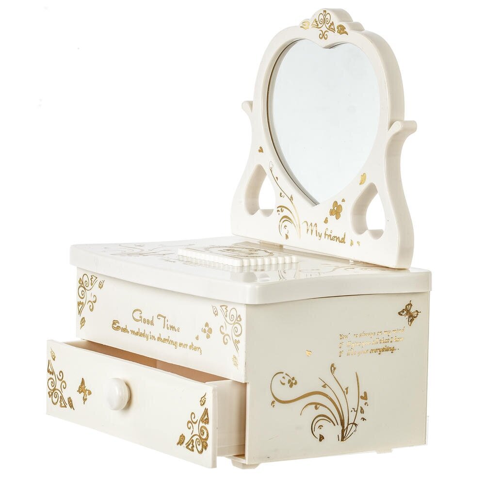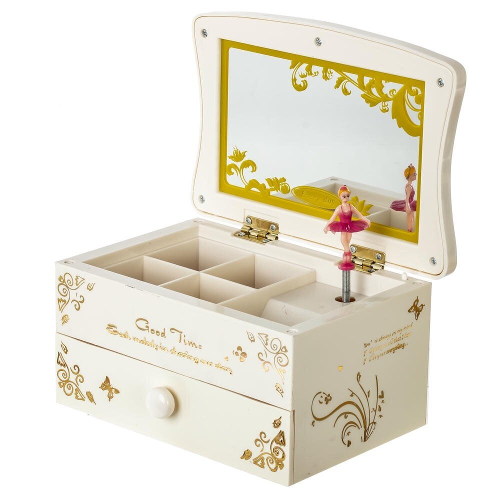 Элегантная музыкальная шкатулка для украшений из прочных полимерных материалов со стеклянным зеркалом. Корпус нежного молочного оттенка украшен золотистым орнаментом и изящной надписью Good Time. Внутри – удобные секции для колец и мелких аксессуаров, в нижней части расположен выдвижной ящичек. При заведении механизма ключом и поднятии крышки звучит мелодия, а миниатюрная балерина в розовом платье плавно вращается перед зеркалом. Шкатулка станет красивым и функциональным украшением туалетного столика и трогательным подарком для девочки или романтичной девушки.