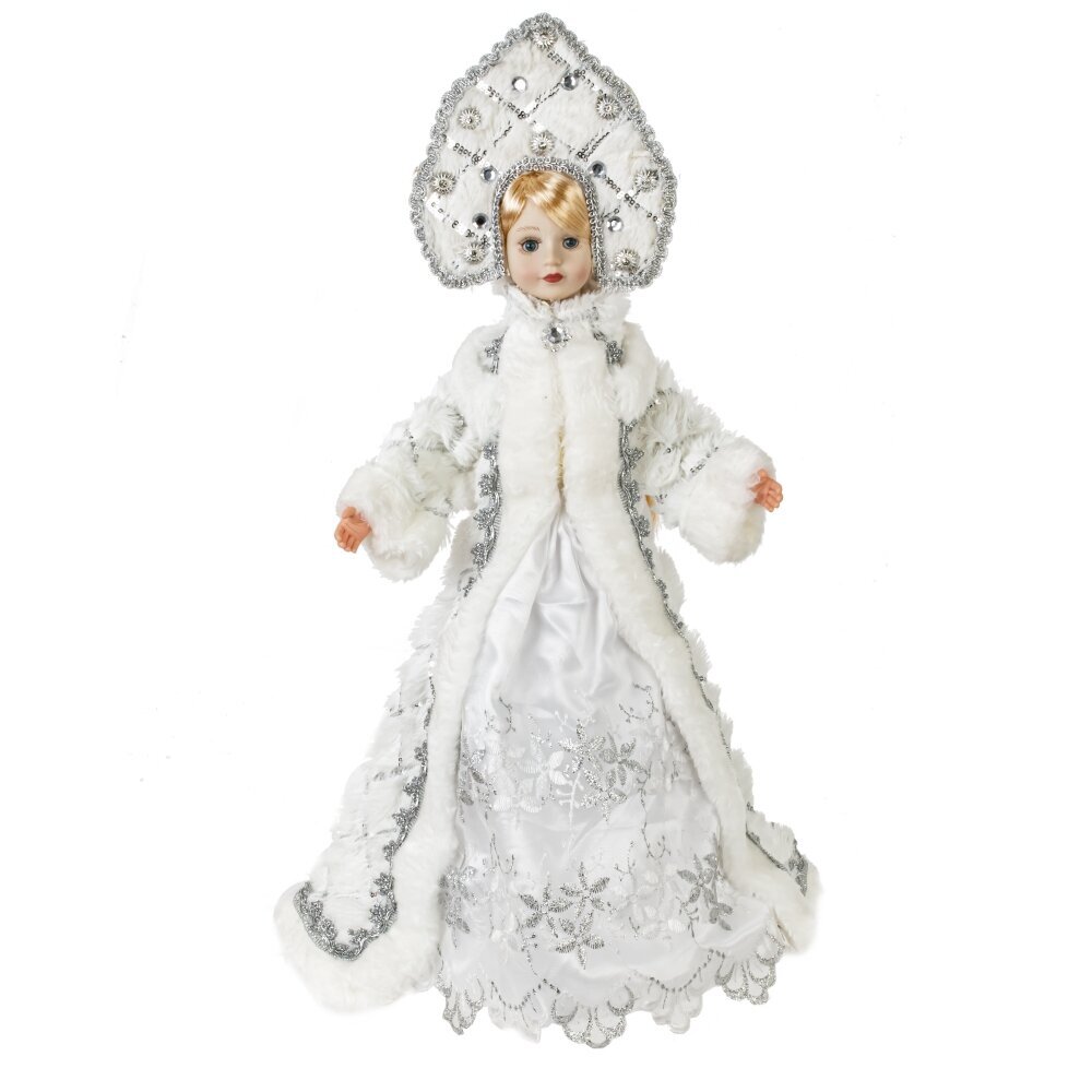 Снегурочка в роскошном белом наряде с меховой отделкой и кокошнике будет прекрасным подарком к Новому году. Ее можно поставить под елку, а так же использовать как милый подарок.