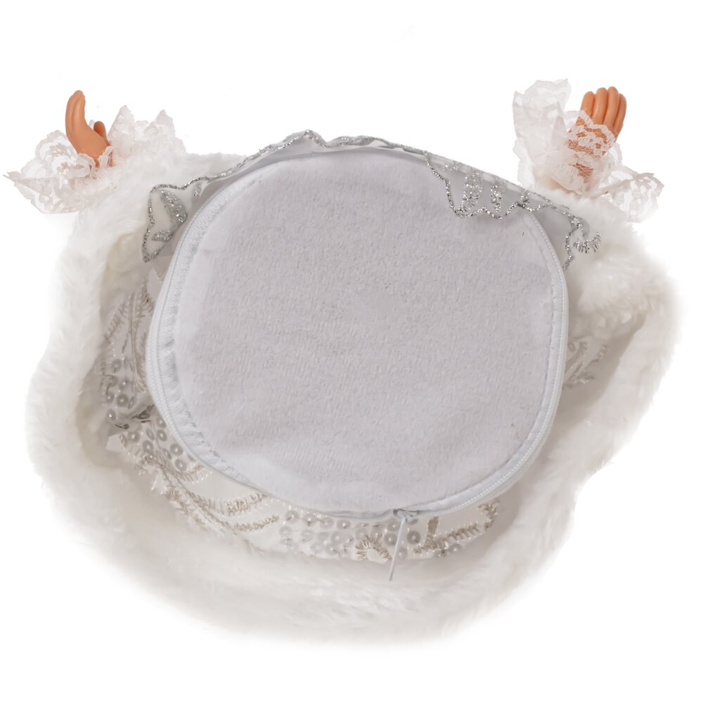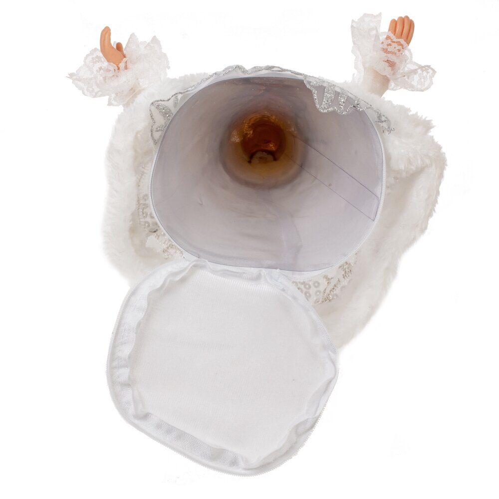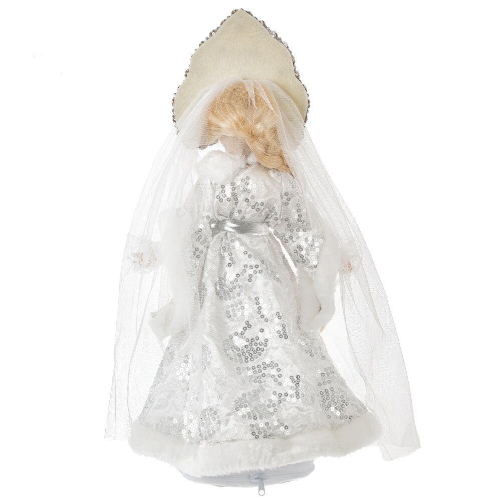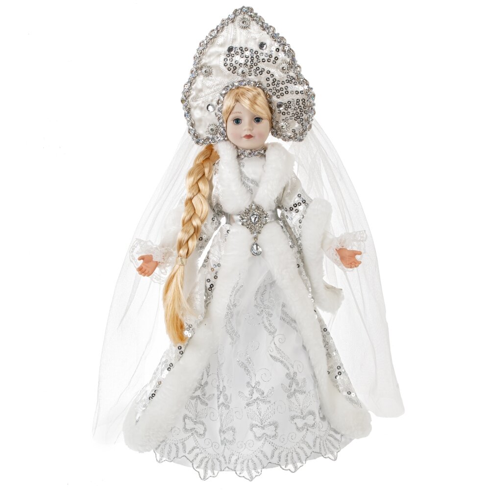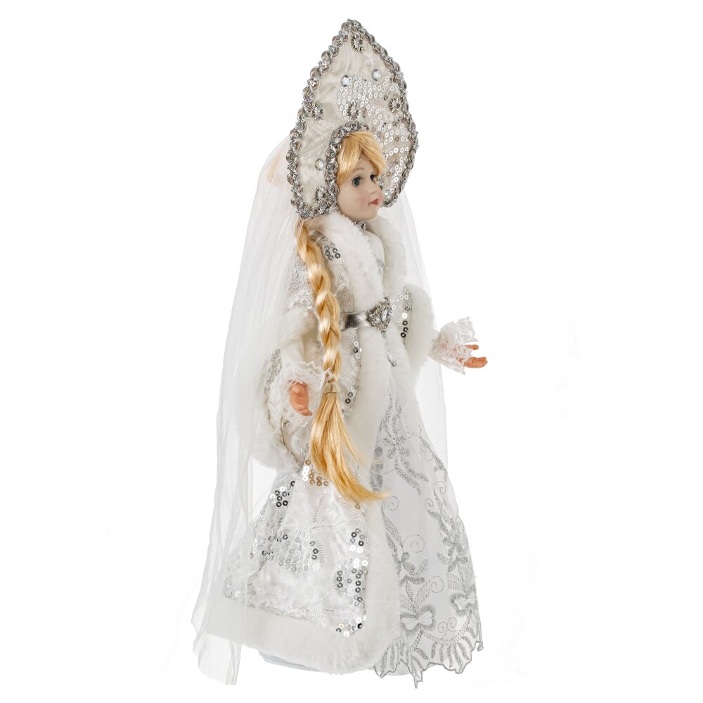 Снегурочка с ёмкостью для конфет — это невероятно красивая декоративная кукла высотой 53 см. Её изящное лицо и кисти рук выполнены из полимерных материалов. Она облачена в роскошный белый наряд с меховой отделкой, украшенной серебристыми деталями. На голове Снегурочки кокошник с фатой, а длинная светлая коса добавляет её образу очарования. Под платьем находится ёмкость для конфет, что делает эту куклу прекрасным подарком для маленьких и больших любителей сладостей.