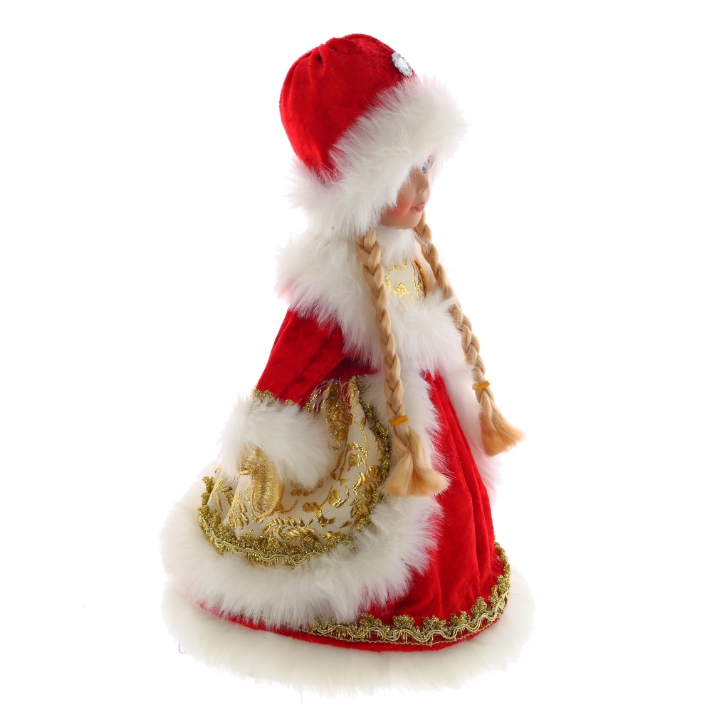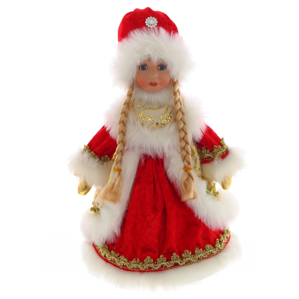 Прелестная Снегурочка в роскошной красной шубке с вышивкой и меховой отделкой, с емкостью для подарков. Кукла будет превосходно смотреться под новогодней елочкой и наполнит Ваш дом сказочной атмосферой, исполняя заветные мечты.