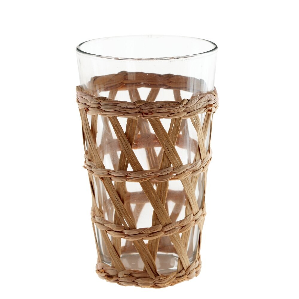 Стеклянный стакан с плетеным соломенным декором. Он сочетает в себе прочность и прозрачность стекла с естественной красотой и теплотой соломы. Так же можно использовать, как вазу для цветов, веток, зелени, или как отдельный элемент декора.