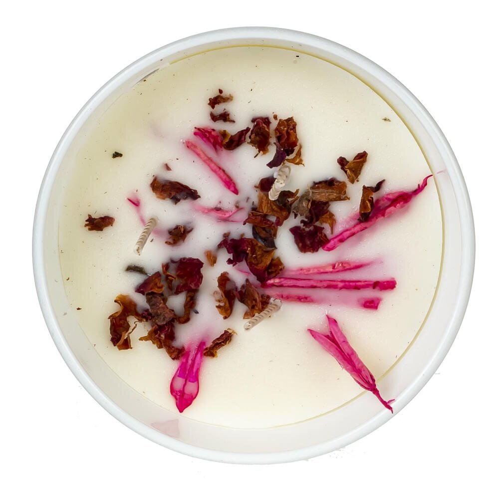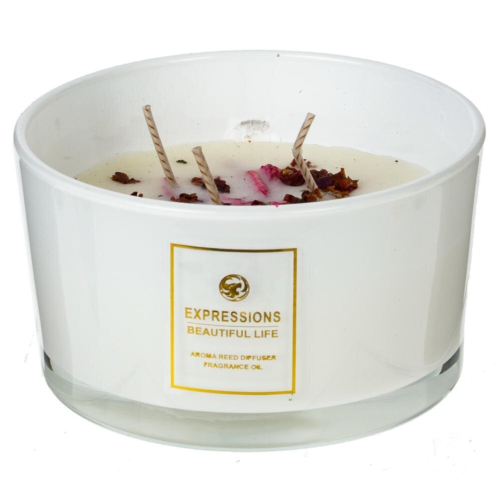 Ароматическая свеча в лаконичном стеклянном стакане. Основа — качественный парафин. На поверхности — лепестки сушёных цветов, которые при нагреве раскрывают нежный букет и создают атмосферу уюта и SPA. Три прочных витых фитиля дают устойчивое, ровное пламя, быстрее прогревают поверхность и обеспечивают равномерное плавление, чтобы аромат мягко заполнял помещение. Плотные стенки из гладкого стекла выдерживают нагрев и защищают поверхность стола, широкое основание придаёт устойчивость. Нейтральный дизайн с золотистой этикеткой легко впишется в современный интерьер, станет акцентом на тумбе, полке или в ванной. Подойдёт для релакса, романтических вечеров и как стильный подарок.