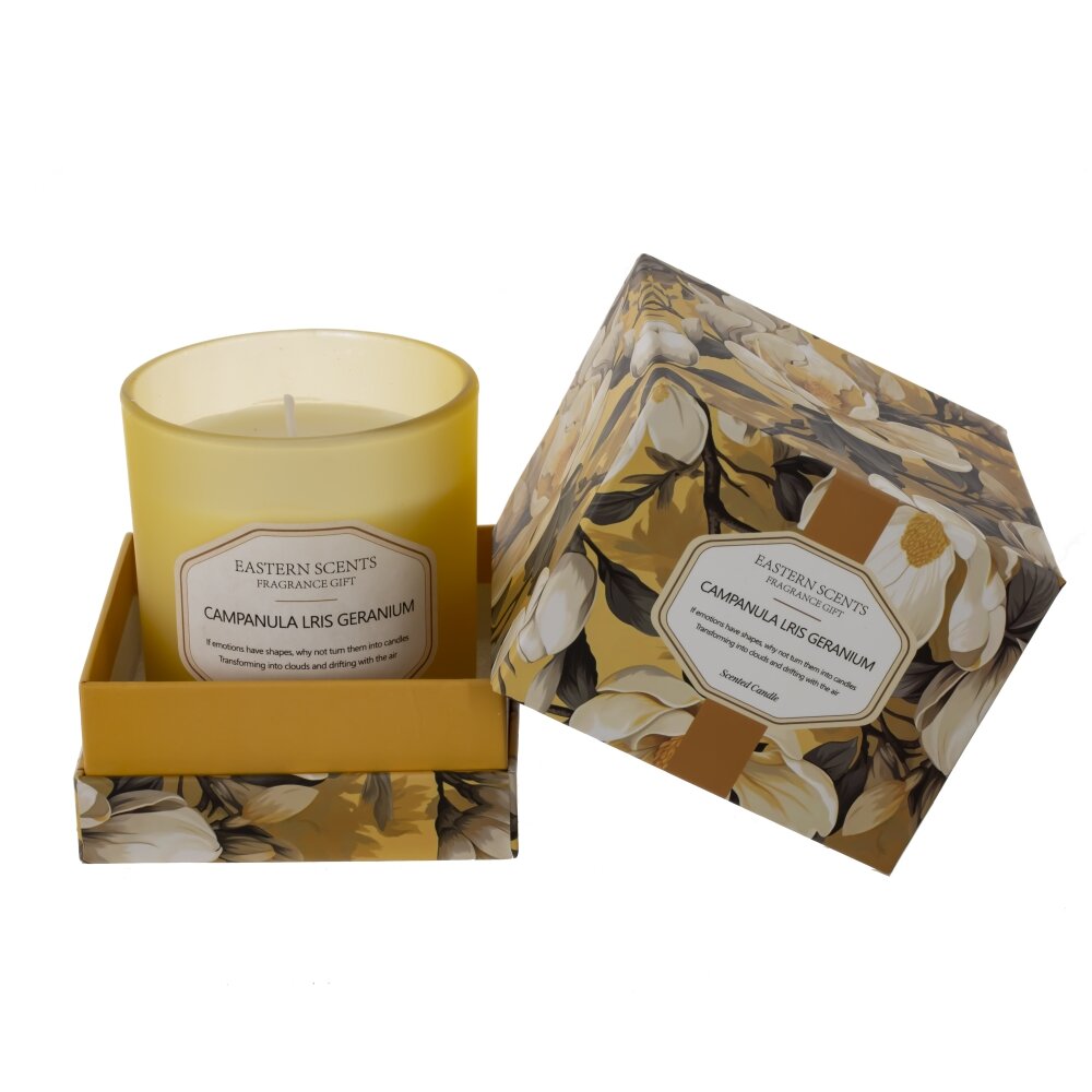 Ароматическая свеча в матовом стеклянном стакане диаметром 7,5 см станет стильным акцентом в интерьере и источником мягкого, уютного света. Корпус выполнен из прочного стекла нежно?жёлтого оттенка, внутри — аккуратный один фитиль и качественный парафин, обеспечивающий ровное горение без лишнего дыма. Композиция Eastern Scents Campanula Iris Geranium сочетает ноты колокольчика, ириса и герани, создавая чистый цветочный аромат с деликатной свежестью. Свеча уместна в гостиной, спальне или ванной, помогает расслабиться после долгого дня и красиво вписывается в подарочный набор. Простой и элегантный дизайн подойдёт к современным и классическим интерьерам, а стеклянный стакан устойчив и удобен в использовании и последующем уходе.