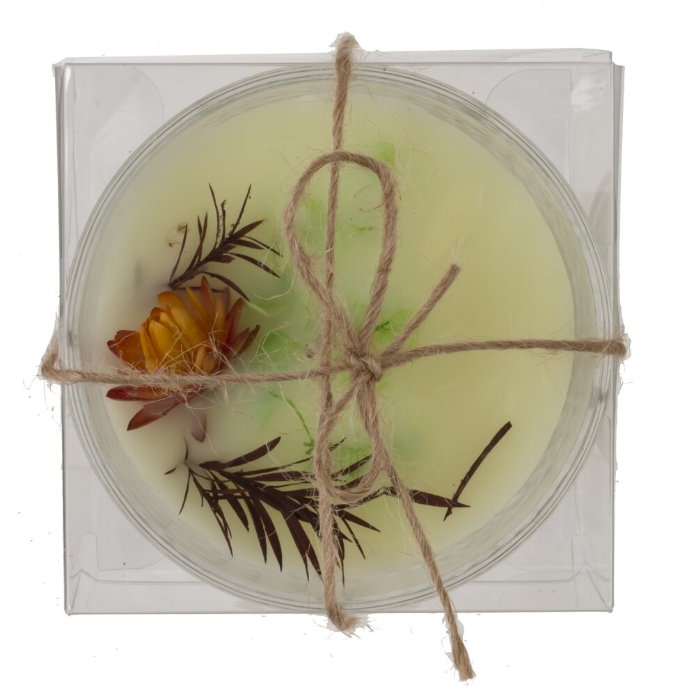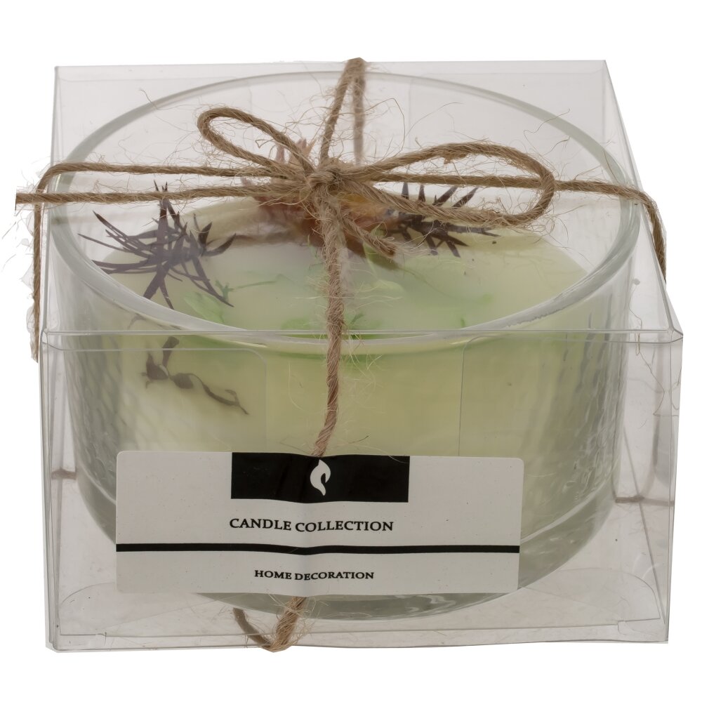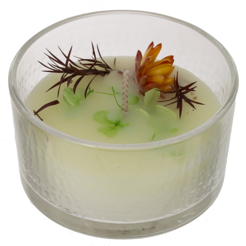 Стильная ароматическая свеча в прозрачном стеклянном стакане диаметром 8,5 см. Изготовлена из качественного парафина, цвет воска — нежный молочно?кремовый. Верх украшен природными акцентами: мини?бутон теплого оранжевого оттенка, зеленые лепестки и тонкие темные веточки, создающие эффект гербария. По центру расположен плотный витой фитиль для ровного, спокойного пламени и равномерного плавления. Текстурированное стекло добавляет свечe выразительности и гармонично сочетается с любым интерьером — от сканди до классики. Идеальна для создания уютной атмосферы дома, во время ванны, медитации или сервировки стола, а также в качестве подарка. Рекомендуется ставить на жаропрочную поверхность и не оставлять без присмотра.