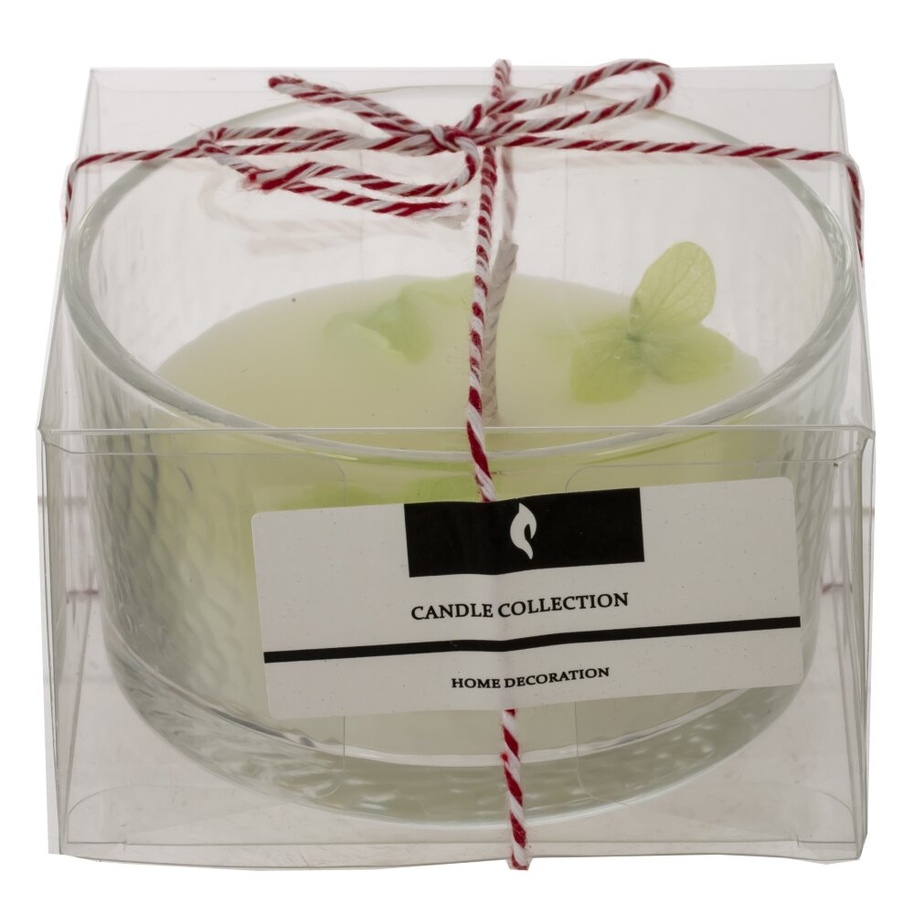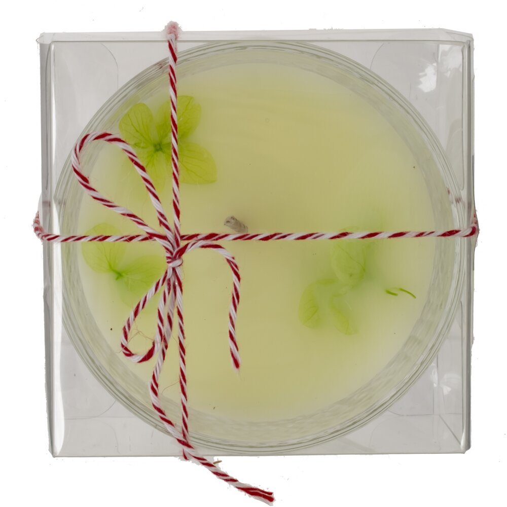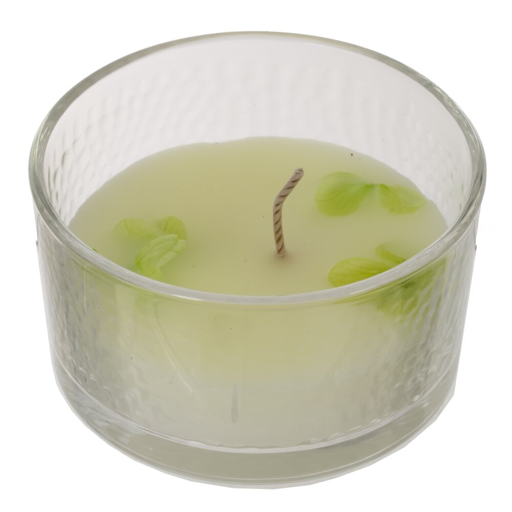 Ароматическая свеча в низком прозрачном стакане из фактурного стекла, диаметр 8,5 см. Парафиновый наполнитель нежного светло?зеленого оттенка с декоративными лепестками/листочками внутри и одним центральным фитилем. При горении дает мягкое теплое свечение и тонкий аромат, создавая атмосферу уюта в гостиной, спальне или ванной. Лаконичный дизайн гармонично смотрится в любом интерьере и подойдет в качестве небольшого подарка. Материалы: парафин, стекло. Советы по использованию: подрезайте фитиль до 5–7 мм, ставьте на негорючую поверхность, держите вдали от детей и не оставляйте без присмотра.