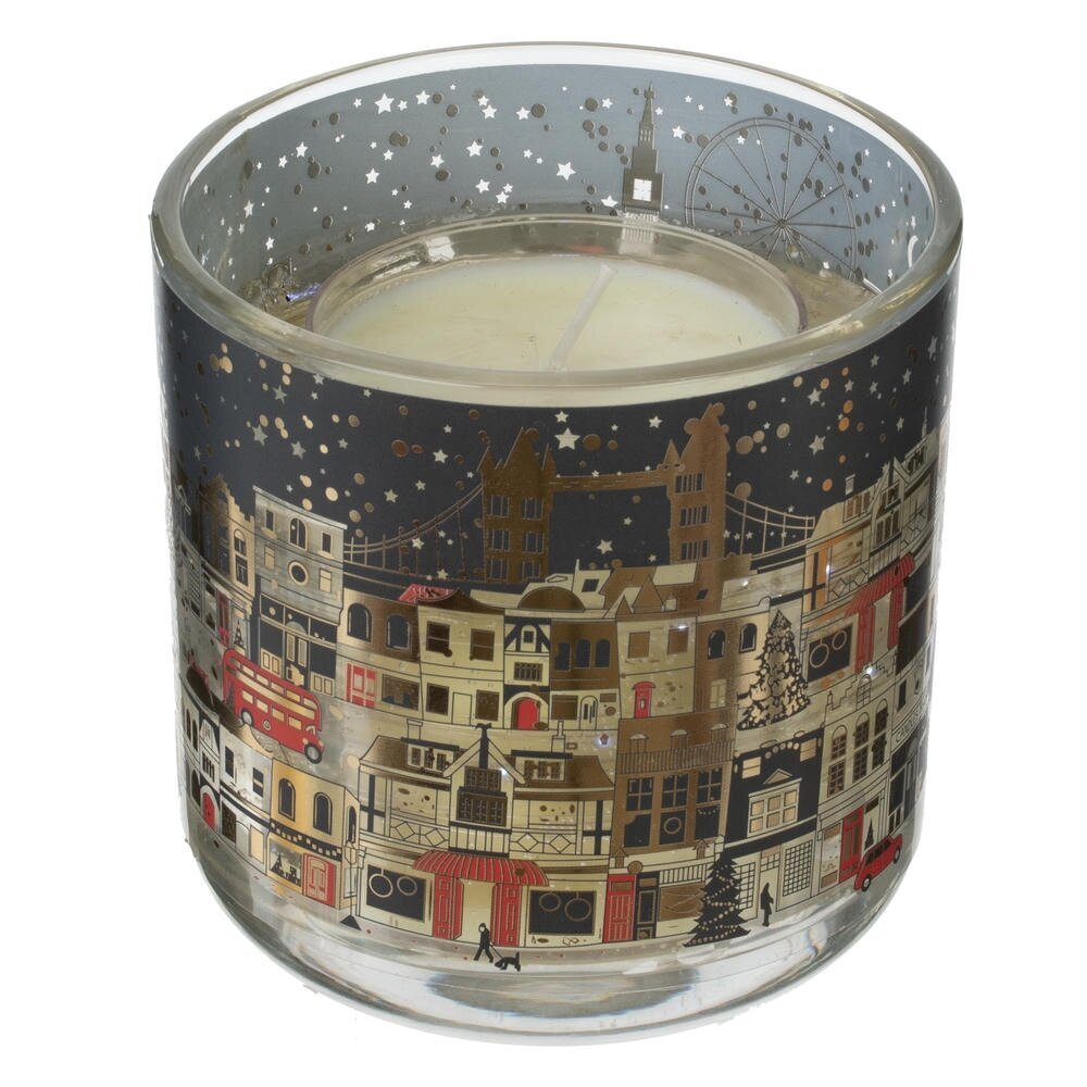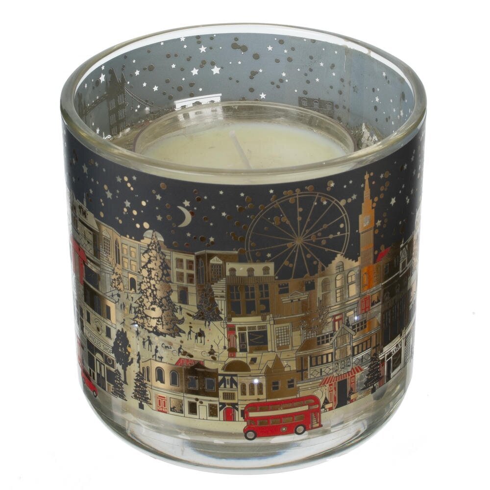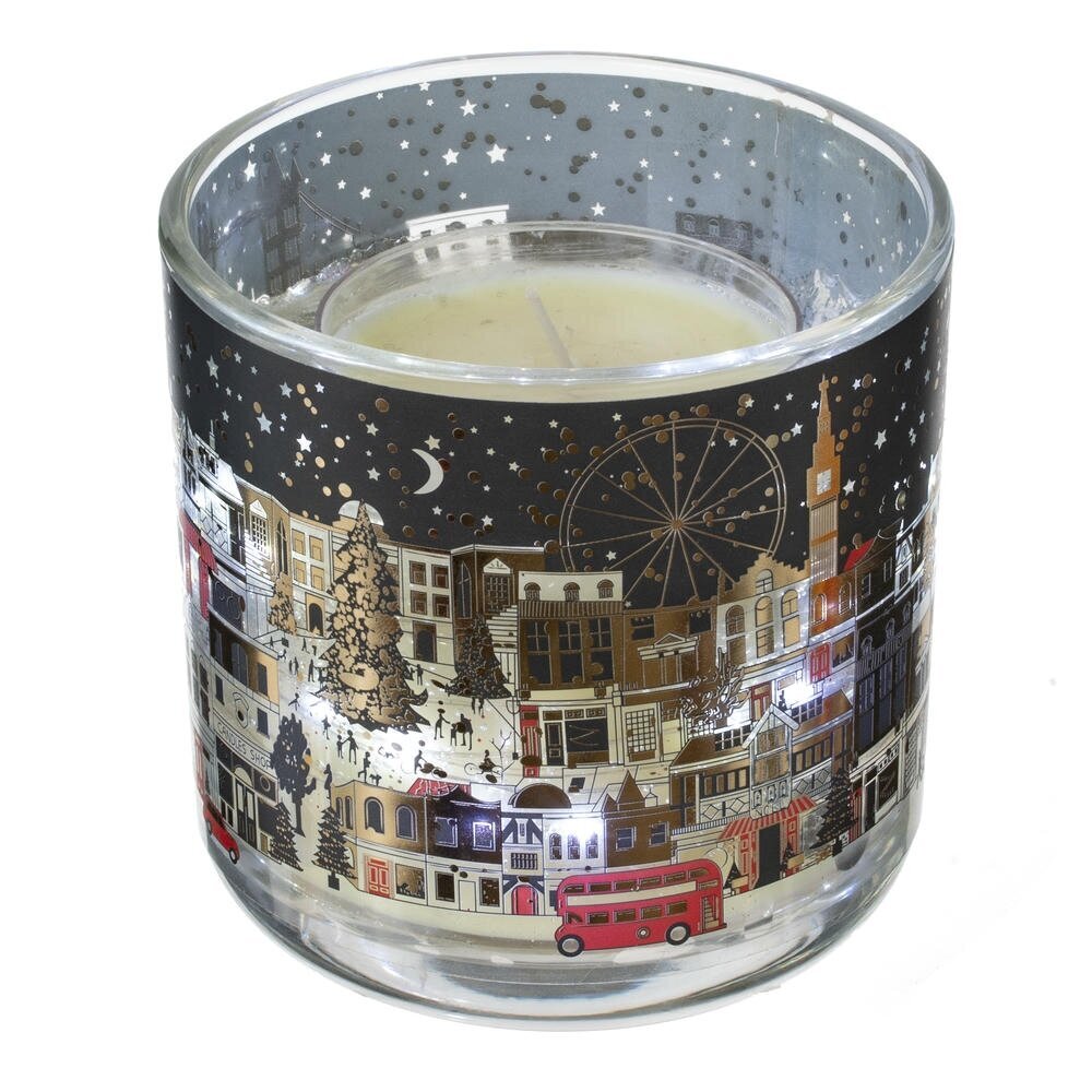 Ароматическая свеча с подсветкой в стеклянном подсвечнике – стильный акцент для уютных вечеров и праздничного декора дома. Корпус выполнен из прочного прозрачного стекла (L 10 ? W 10 ? H 10 см) с эффектным панорамным рисунком вечернего города: дома, зимние деревья, колесо обозрения, звездное небо и узнаваемый двухэтажный автобус создают атмосферу европейского рождественского города. Свеча изготовлена из качественного парафина, диаметр вставки – 5,5 см. Внутри предусмотрен специальный проводок и гелевая прослойка: при зажигании пламени мягкий внутренний свет красиво подсвечивает рисунок, усиливая мерцание и создавая эффект «живой» иллюминации. Подходит для использования в гостиной, спальне или на праздничном столе, станет отличным подарком и элементом зимнего декора интерьера.