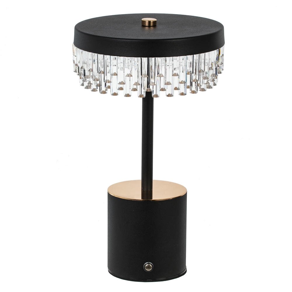 Стильный настольный светильник станет эффектным акцентом в современном интерьере. Корпус выполнен из прочного металла и полимерных материалов в элегантном чёрном цвете с золотистыми деталями. Плоский верхний плафон украшен подвесками из прозрачных гранёных элементов, создающих мягкие блики и уютное рассеянное освещение. Высокая цилиндрическая подставка обеспечивает хорошую устойчивость на столе, тумбе или прикроватной тумбочке. Удобная кнопка включения расположена на основании, длина сетевого шнура 1,55 м позволяет свободно разместить светильник в нужной зоне без использования удлинителей. Подходит для ламп Е27 . Идеальное решение для спальни, гостиной, рабочего стола или зоны чтения.