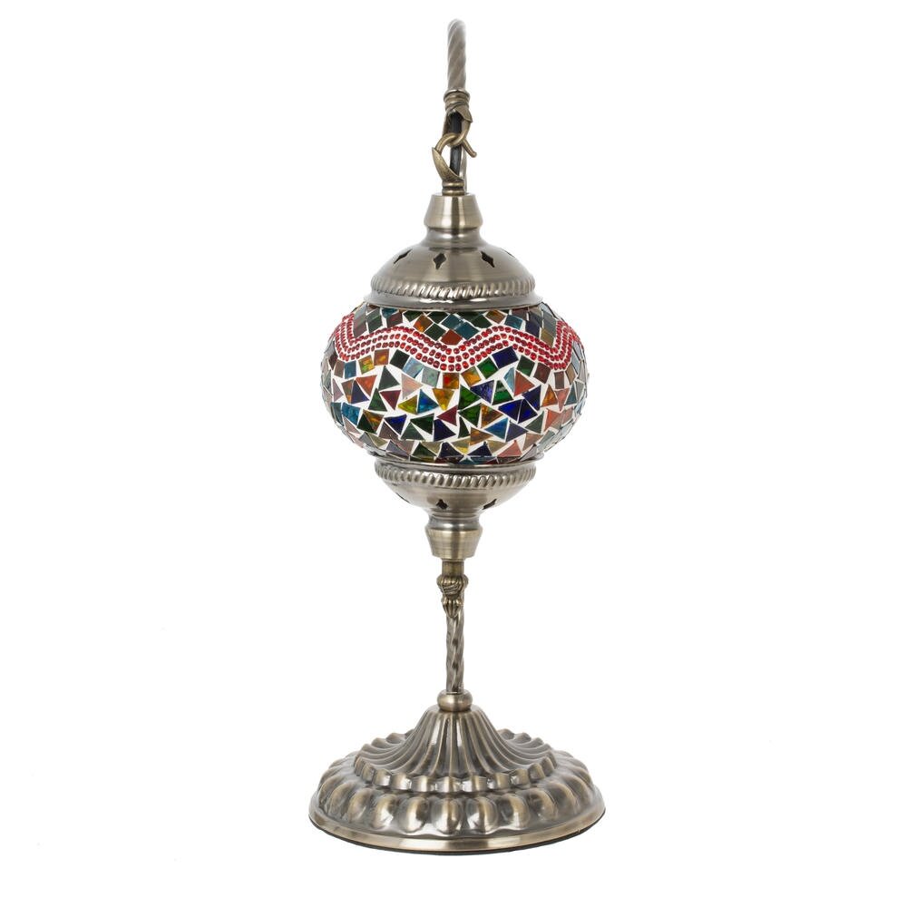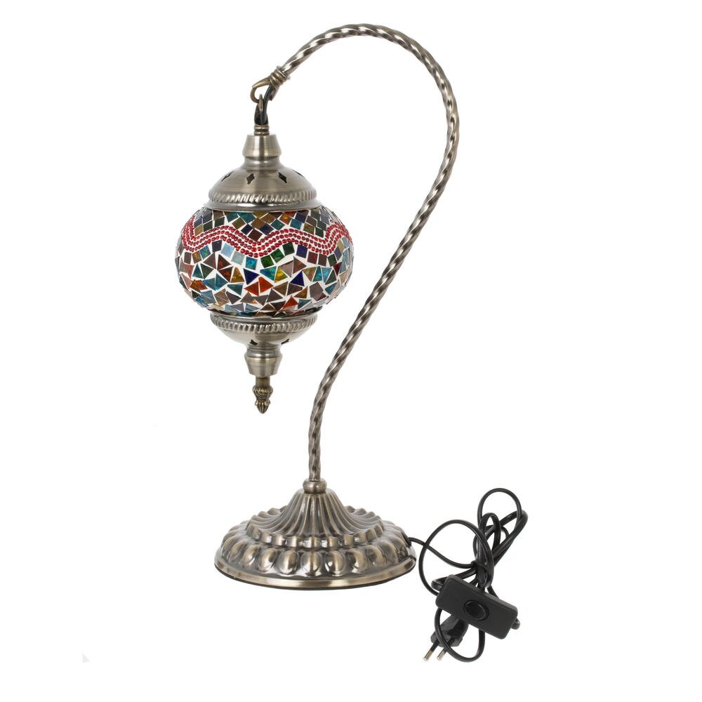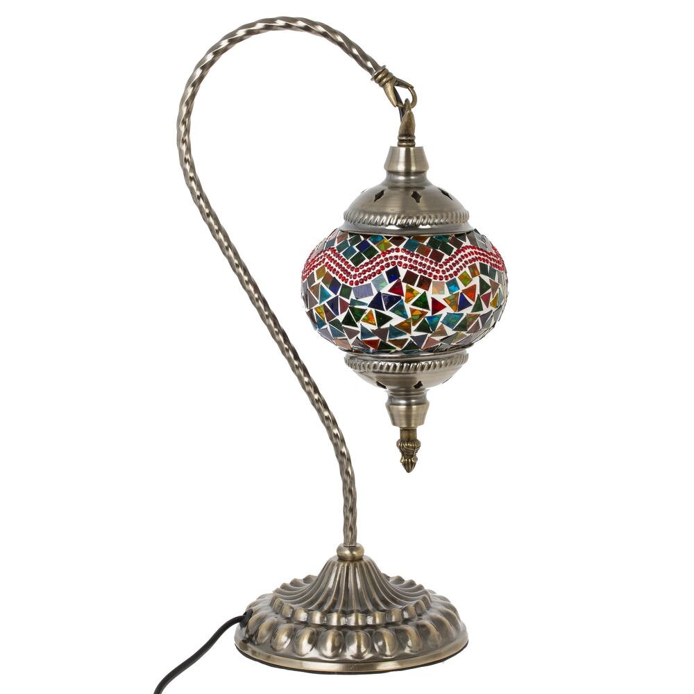 Настольный декоративный светильник в восточном стиле с мозаичным плафоном станет ярким акцентом в интерьере гостиной, спальни или зоны отдыха. Основание и изогнутая ножка выполнены из прочного металла с изысканным рельефным декором, плафон из цветного стекла и полимерных материалов образует оригинальный орнамент и создаёт мягкое рассеянное освещение. Светильник рассчитан на лампу с цоколем Е14, длина шнура 1,20 м обеспечивает удобное подключение к розетке и позволяет легко переставлять модель в нужное место.