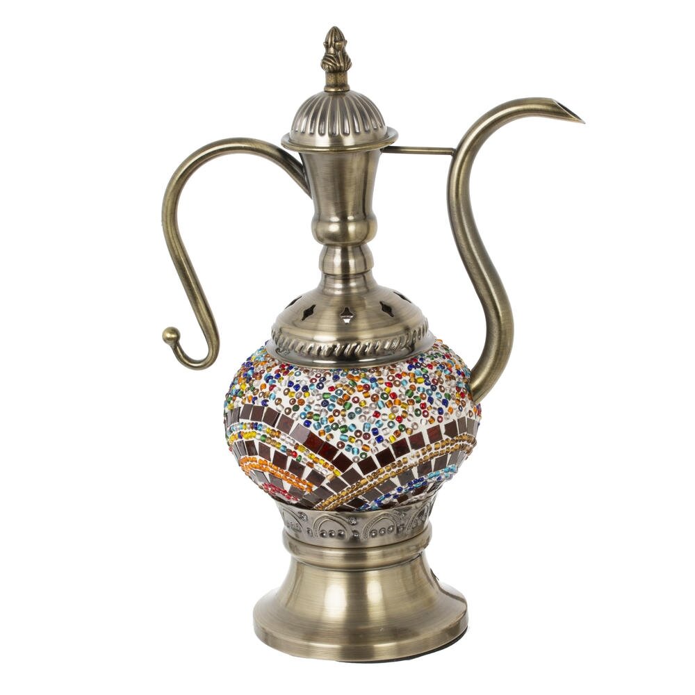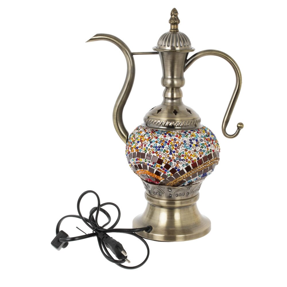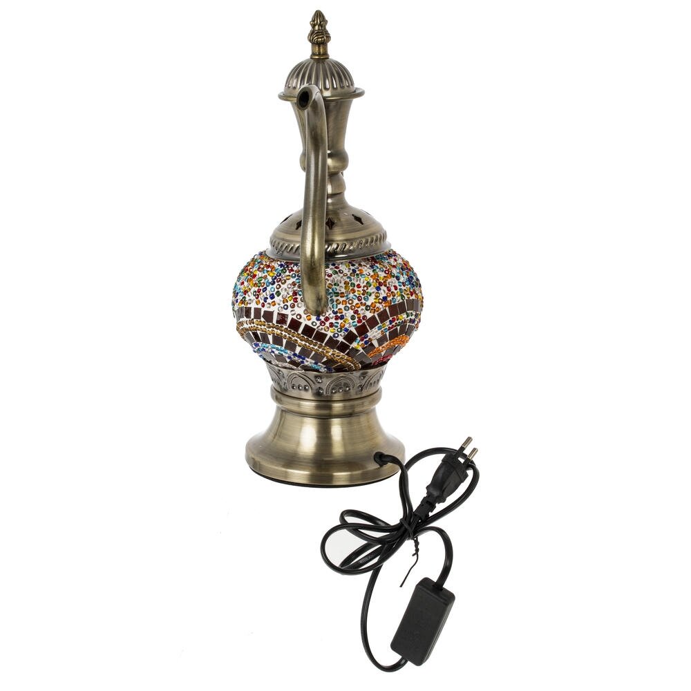 Настольный светильник в восточном стиле, выполненный в форме изящного кувшина, станет эффектным акцентом любого интерьера. Корпус из металла с покрытием «под бронзу» гармонично сочетается с ярким стеклянным плафоном, украшенным мозаикой из разноцветных стеклянных и полимерных элементов. При включении свет мягко рассеивается через мелкие декоративные вставки, создавая уютную атмосферу и игру бликов на стенах. Светильник рассчитан на лампу с цоколем Е14 и легко подключается к сети с помощью шнура длиной 1,1 м. Подойдёт для гостиной, спальни, кабинета или кафе в этническом и классическом стиле, а также станет оригинальным подарком и стильным элементом декора.