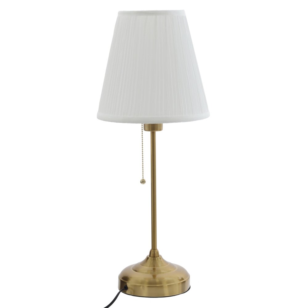 Настольный светильник – стильное и практичное решение для освещения рабочего стола, прикроватной тумбы или зоны чтения. Основание и ножка с покрытием под латунь, что придаёт изделию классический и в то же время современный вид. Плафон из текстильных и полимерных материалов мягко рассеивает свет, создавая комфортную атмосферу без резких бликов. Удобное включение осуществляется с помощью декоративной цепочки?выключателя. Шнур длиной 1,06 м позволяет легко разместить светильник рядом с розеткой, не используя удлинители. Совместим с любой энергосберегающей или светодиодной лампой Е27 нужной мощности.