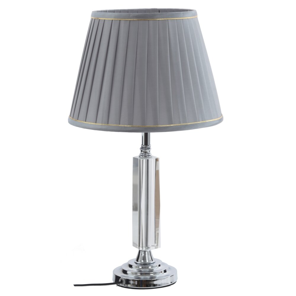 Настольный светильник сочетает современную элегантность и классический дизайн. Плафон выполнен из серой гофрированной ткани с тонкой золотистой окантовкой по краю, мягко рассеивает свет и создаёт уютную атмосферу. Основание из хромированного металла с прозрачной вставкой визуально напоминает кристалл и придаёт интерьеру ощущение легкости и изысканности. Светильник идеально подойдёт для прикроватной тумбы, рабочего стола или зоны отдыха в гостиной. Длина шнура 1 м обеспечивает удобство подключения к розетке, а стандартный патрон Е27 позволяет использовать широкий выбор ламп накаливания, светодиодных или энергосберегающих.