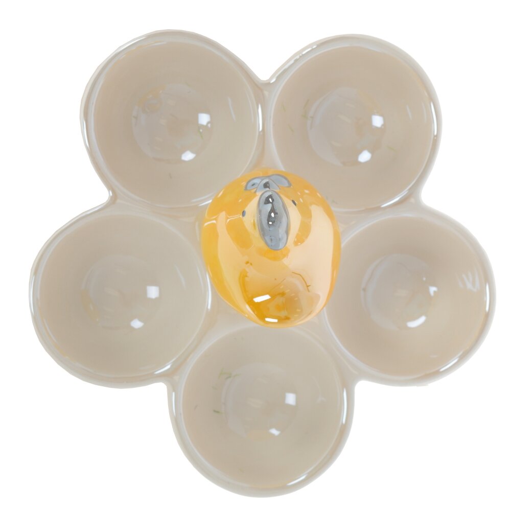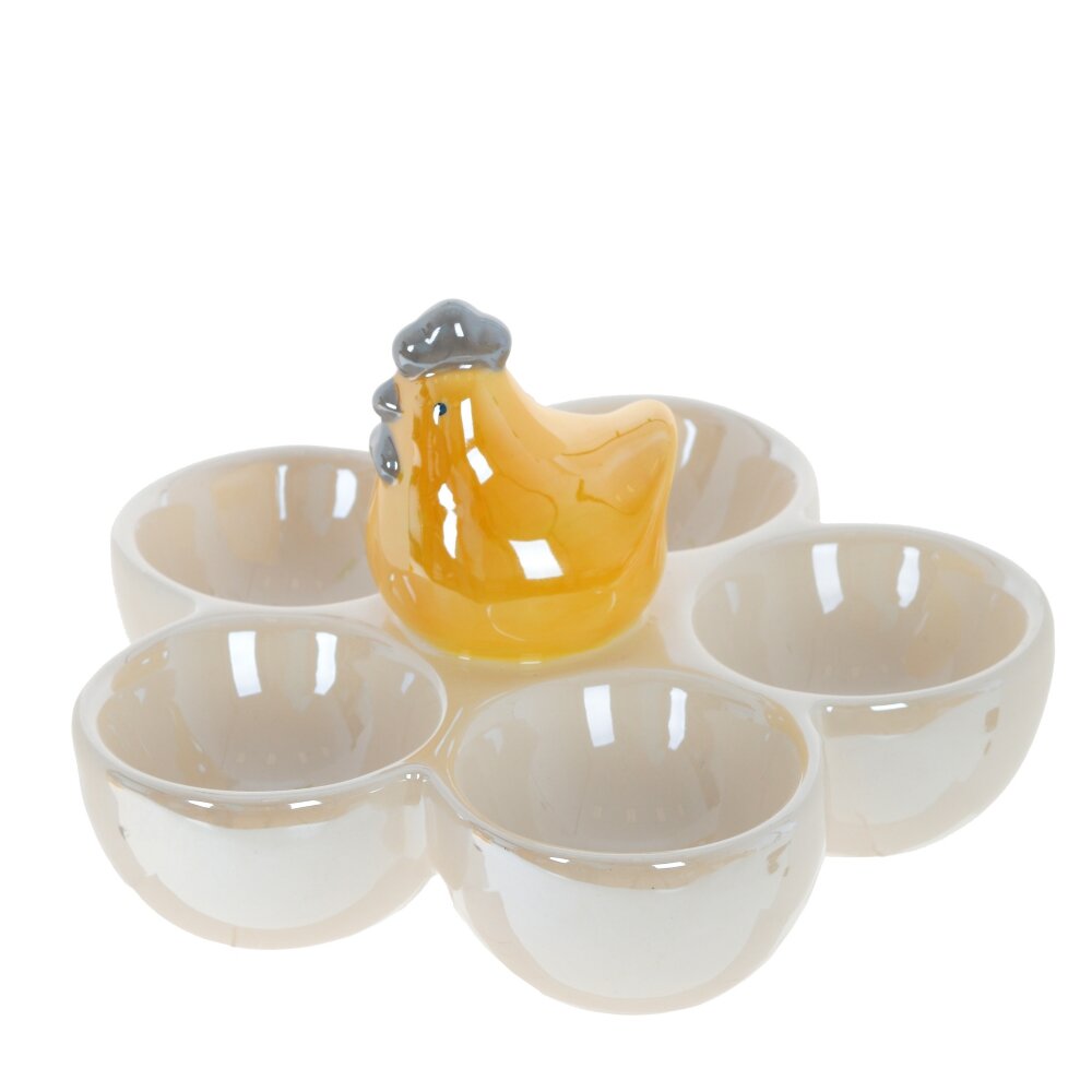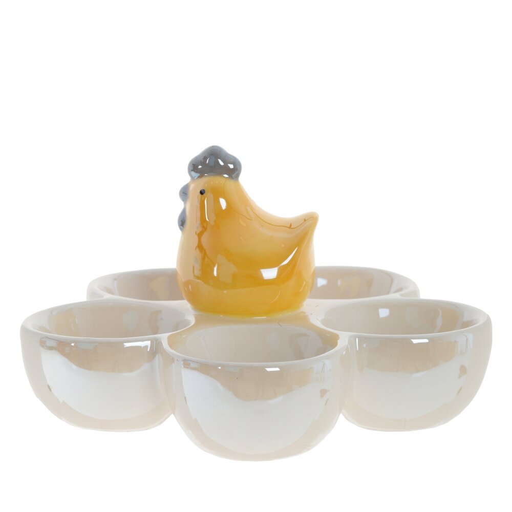 Пасхальная подставка для яиц – это изысканный аксессуар, который добавит праздничное настроение и элегантность вашему столу во время Пасхи. Изготовлена из керамики, имеет стильный дизайн. Основной декоративный элемент подставки – фигурка курочки, расположенная в центре. Размеры подставки оптимальны для размещения пяти яиц среднего размера.