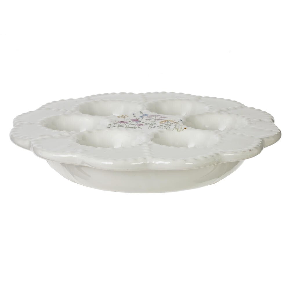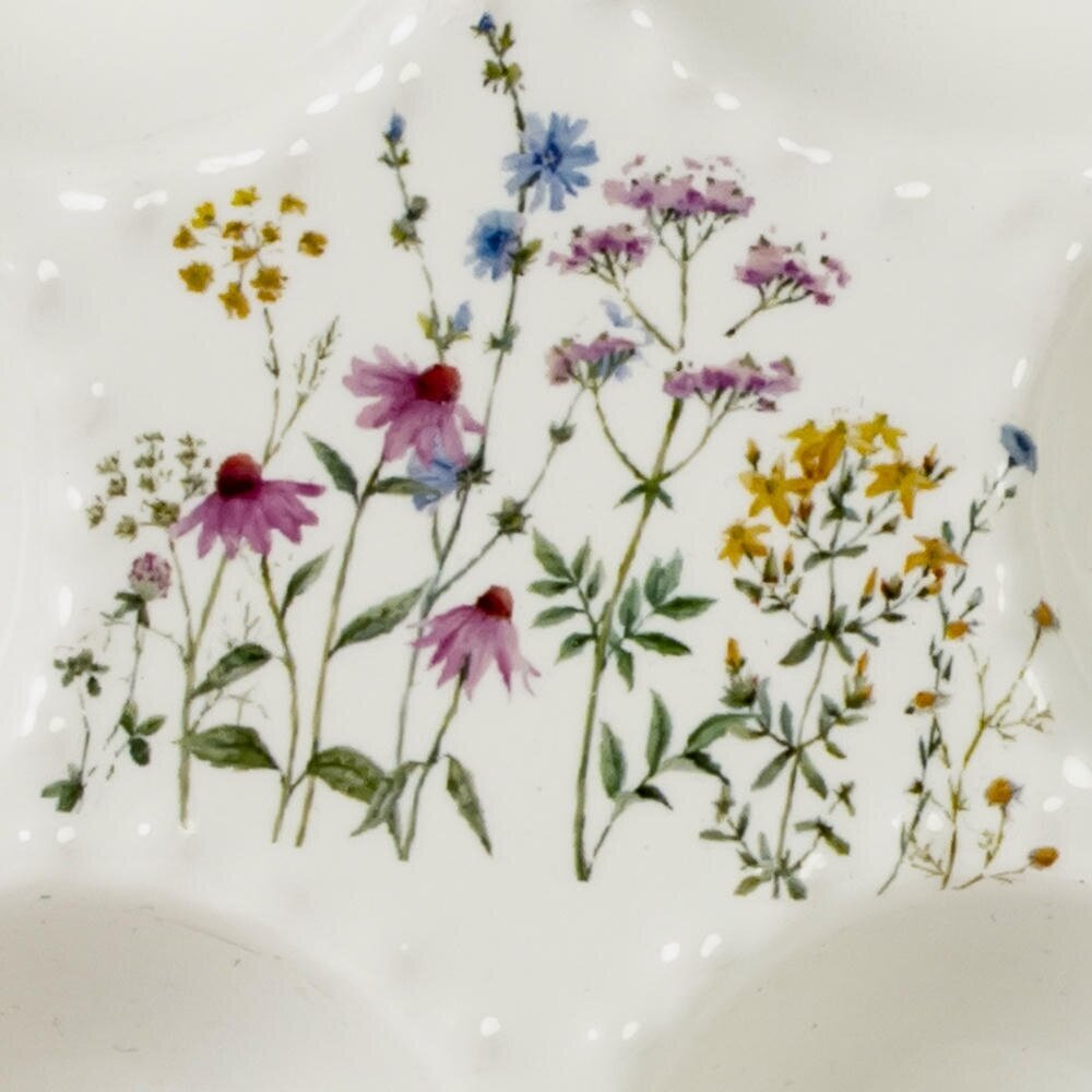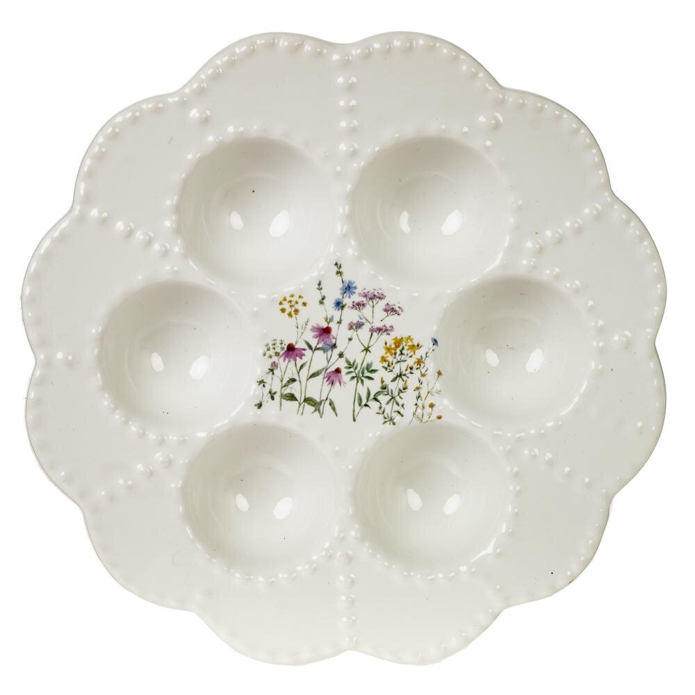 Элегантная пасхальная тарелка для 6-ти яиц из качественной керамики станет украшением праздничного стола. Круглая форма с волнистым краем и рельефным декором придает изделию изысканный вид, а в центре расположён нежный рисунок полевых цветов, создающий весеннее настроение. Глубокие ячейки надежно фиксируют окрашенные яйца или фаршированные закуски, предотвращая их скатывание. Гладкая глазурованная поверхность легко моется и устойчива к появлению пятен. Такая тарелка отлично подойдёт для сервировки на Пасху, семейных завтраков и торжественных ужинов, а также станет приятным и практичным подарком к светлому празднику.