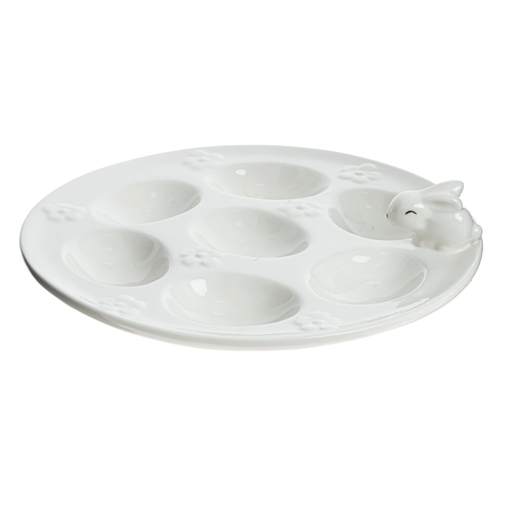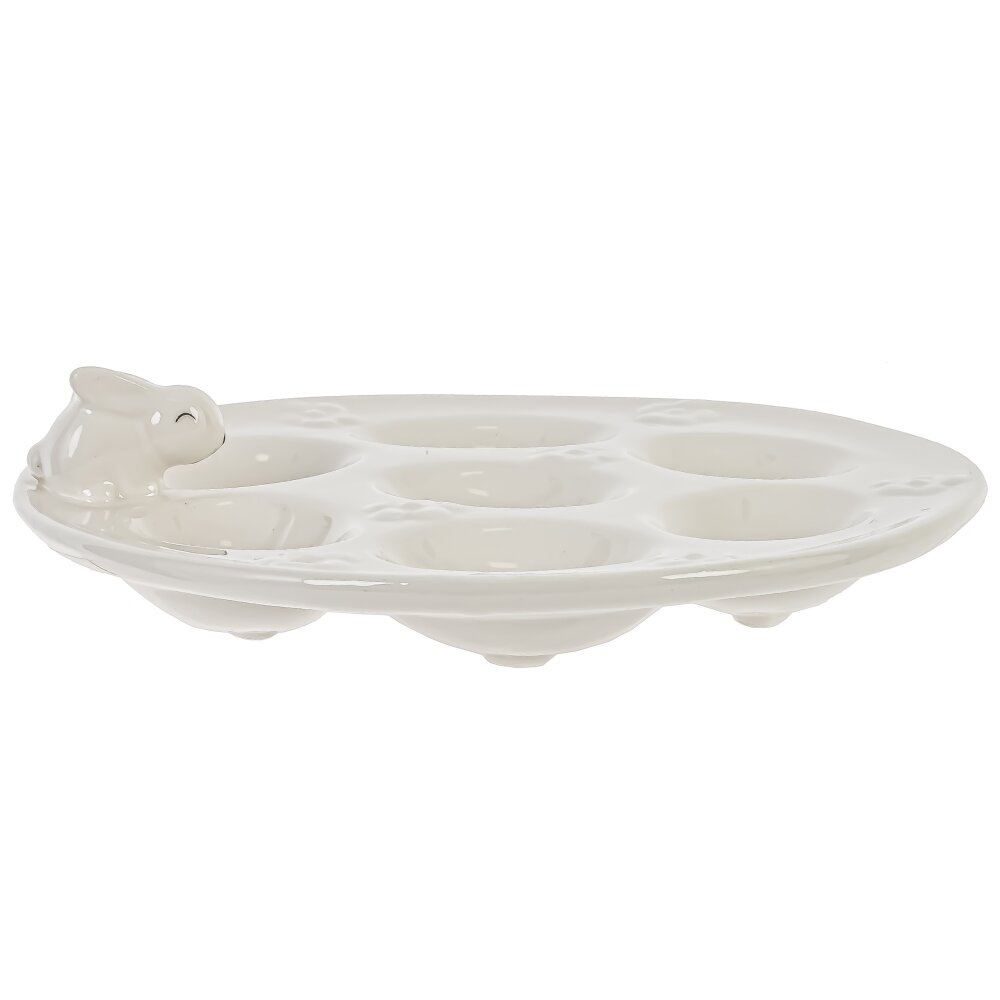 Пасхальная подставка для яиц – это изысканный аксессуар, который добавит праздничное настроение и элегантность вашему столу во время Пасхи. Изготовлена из керамики, имеет стильный дизайн. Основной декоративный элемент подставки – фигурка кролика. Размеры подставки оптимальны для размещения семи яиц среднего размера.