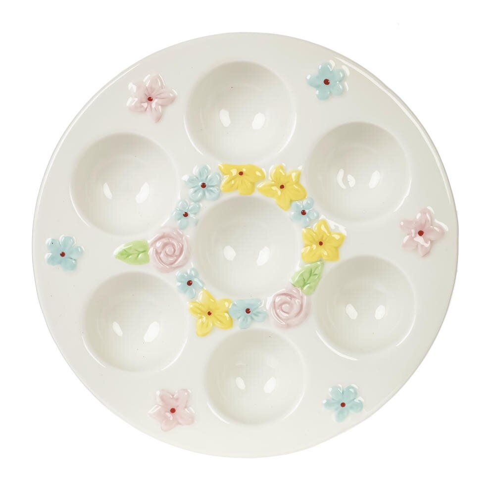 Пасхальная керамическая тарелка для 7 яиц – нежное и практичное украшение праздничного стола. Круглая белая тарелка с гладкой глянцевой поверхностью имеет семь углублений для варёных или крашеных яиц. Центр и края украшены объёмным декором в виде цветочного венка пастельных тонов: розовые розочки, жёлтые и голубые цветы, зелёные листочки. Прочная керамика хорошо держит форму и легко очищается. Идеально подходит для сервировки пасхального завтрака, создания красивой композиции с куличом и сладостями либо в качестве оригинального подарка к Пасхе.