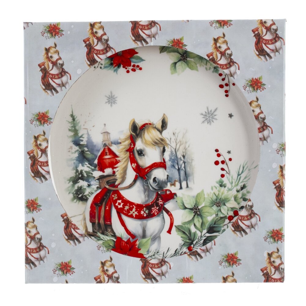 Праздничная тарелка с новогодним декором и символом 2026 года — изящной лошадкой — станет прекрасным дополнением праздничного интерьера или оригинальным подарком к Новому году. Изготовленая с вниманием к деталям, она украшена яркими зимними элементами: снежинками, веточками и праздничными акцентами, создающими волшебное настроение. Тарелка упакована в стильную подарочную коробку, что делает ее готовым решением для подарка родным, коллегам или друзьям. Символ года — лошадка — символизирует силу, стремление вперёд и благополучие, придавая изделию особую смысловую ценность.