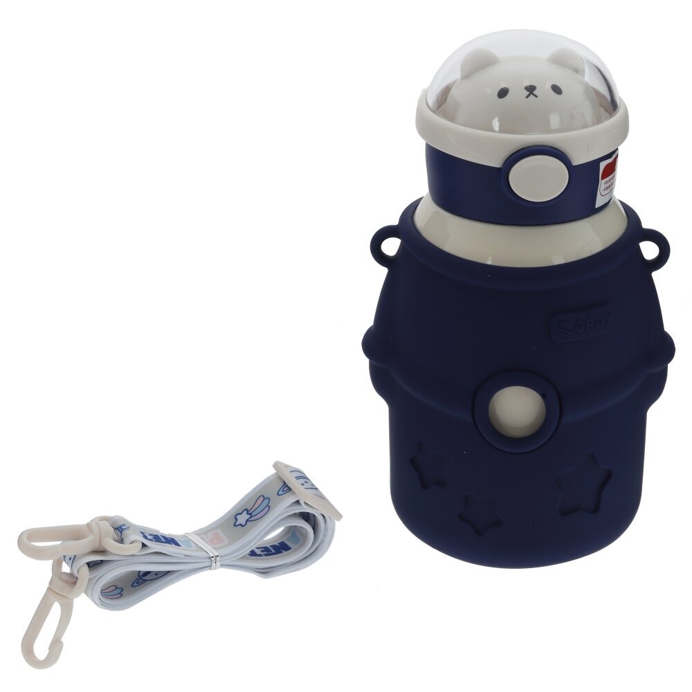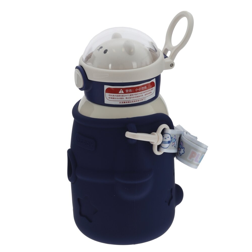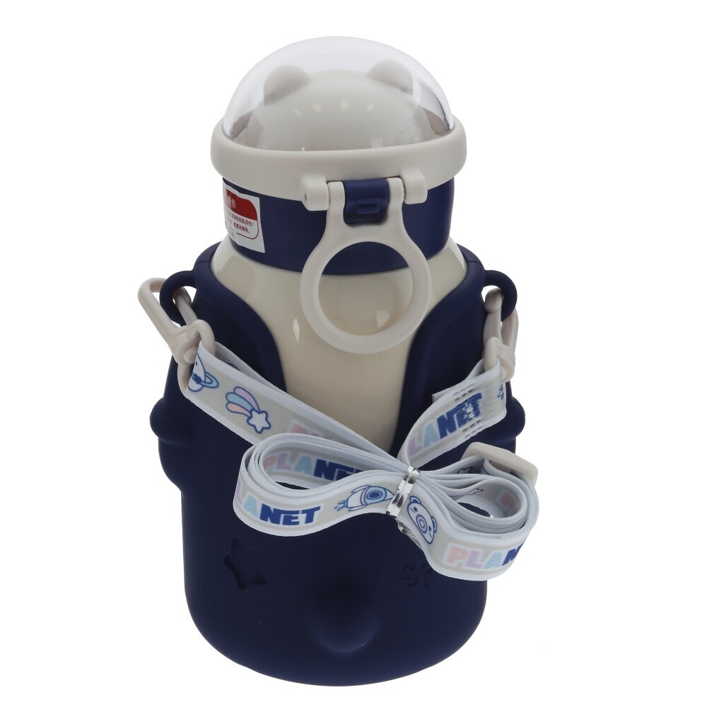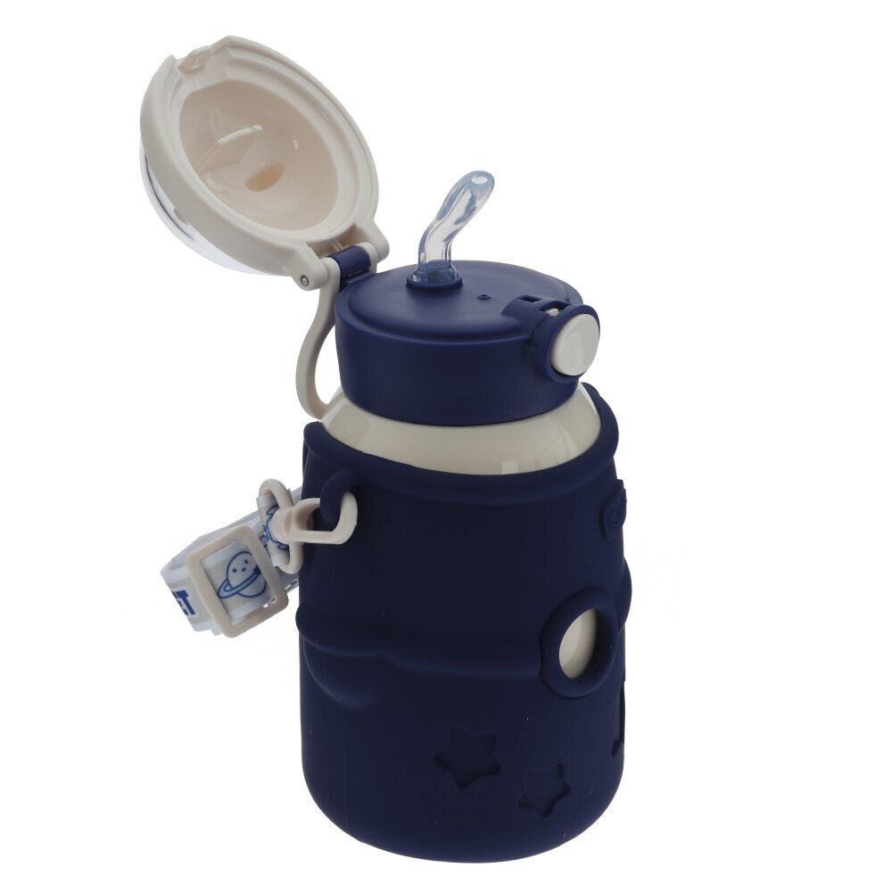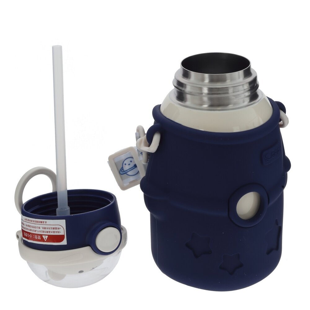 Детский термос объёмом 480 мл – удобное решение для прогулок, школы и поездок. Колба изготовлена из коррозионностойкой стали, надёжно сохраняющей температуру напитков, а внешняя часть выполнена из прочных полимерных материалов. Яркий тёмно?синий чехол с фигурными вырезами в виде звёзд и «иллюминаторов» не только украшает изделие, но и защищает его от ударов и царапин. Откидная крышка с кнопкой открывания и мягким питьевым носиком делает использование термоса безопасным и комфортным для ребёнка, исключая риск проливов. Удобная боковая петля и съёмный ремешок позволяют носить термос в руке, на запястье или прикреплять к рюкзаку. Современный дизайн и практичные материалы делают эту модель отличным выбором для ежедневного использования.
