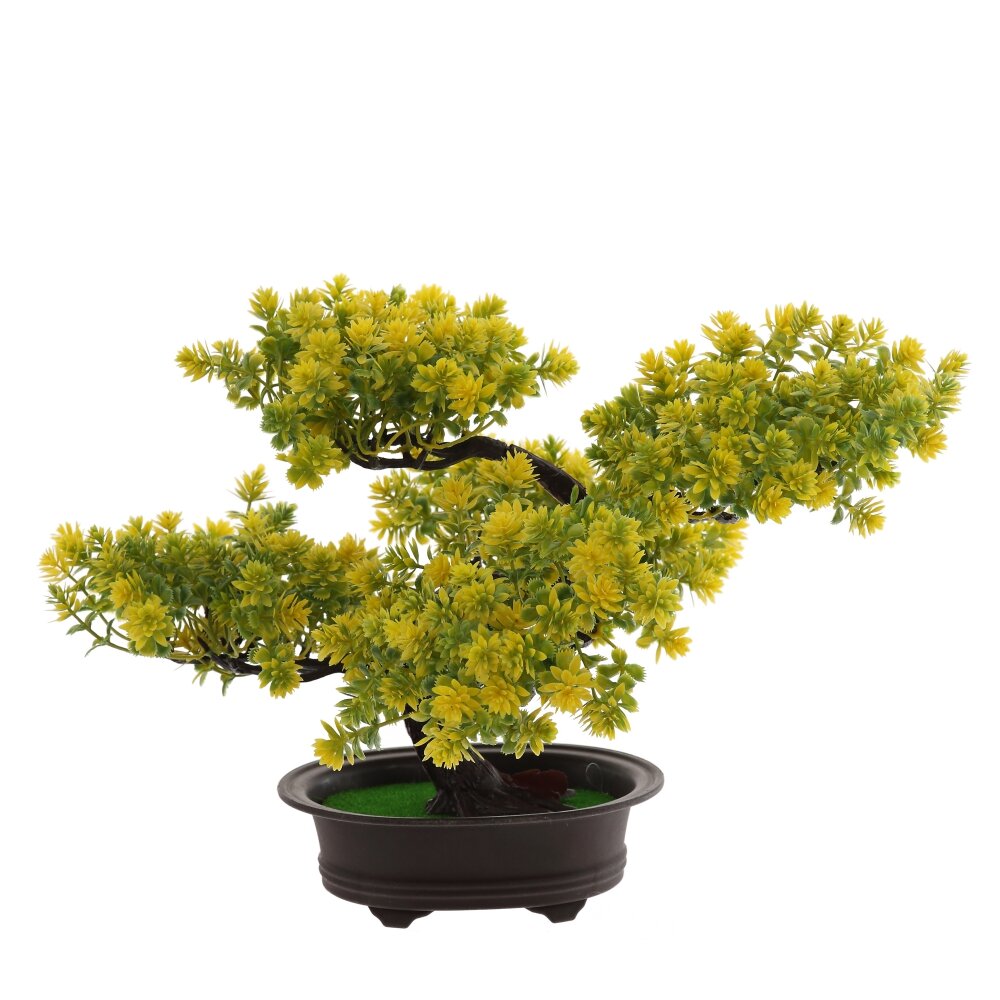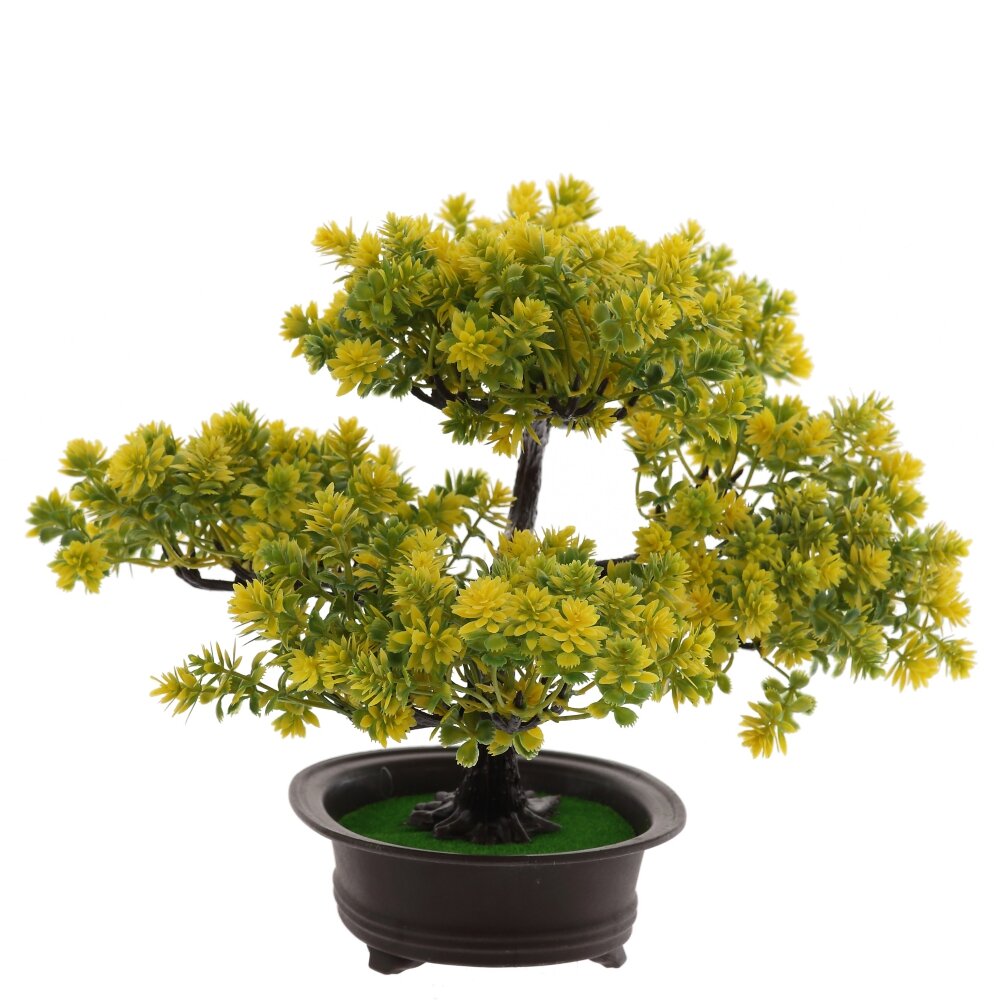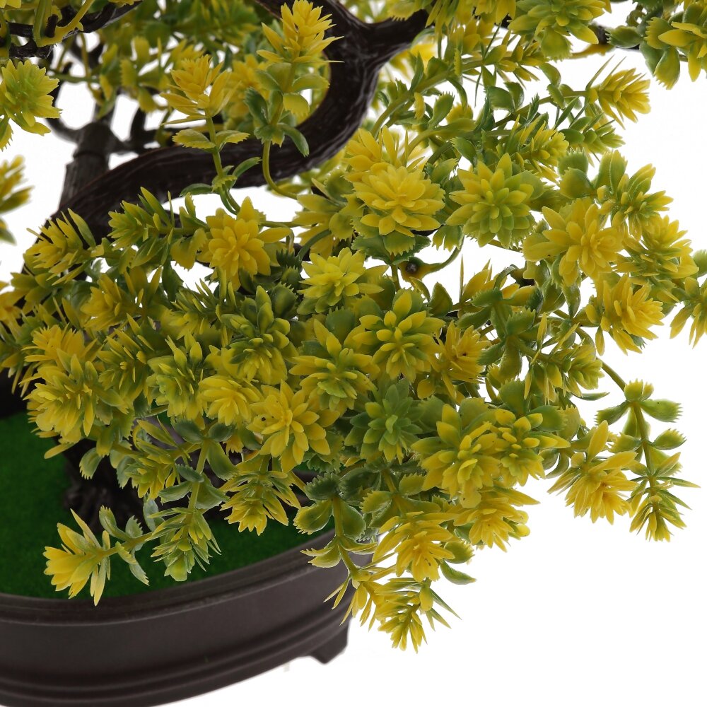 Искусственная цветочная композиция «Бонсай» – стильный декоративный акцент для дома и офиса. Компактное деревце с густой кроной из мелких зелёно?жёлтых листьев имитирует живой бонсай, придавая интерьеру свежесть и ощущение уюта. Гибкие ветви позволяют слегка корректировать форму, создавая идеальную композицию под ваш стиль. Дерево закреплено в тёмном горшке с имитацией дерна, что делает изделие устойчивым и завершённым. Не требует полива, освещения и особого ухода, не вызывает аллергии и долго сохраняет яркий цвет. Идеально подходит для размещения на рабочем столе, подоконнике, полке или в зоне приёма гостей, гармонично дополняя как современный, так и классический интерьер.