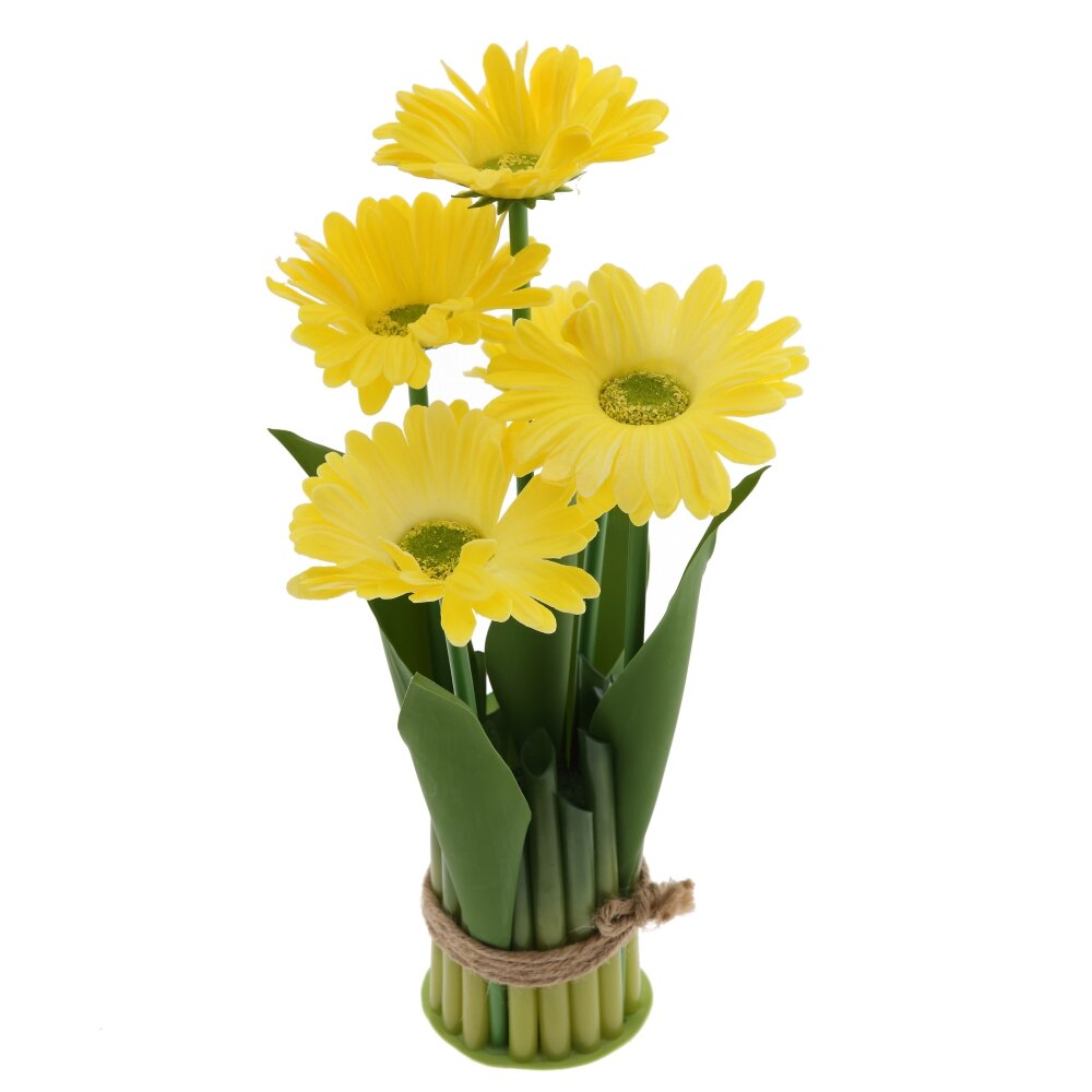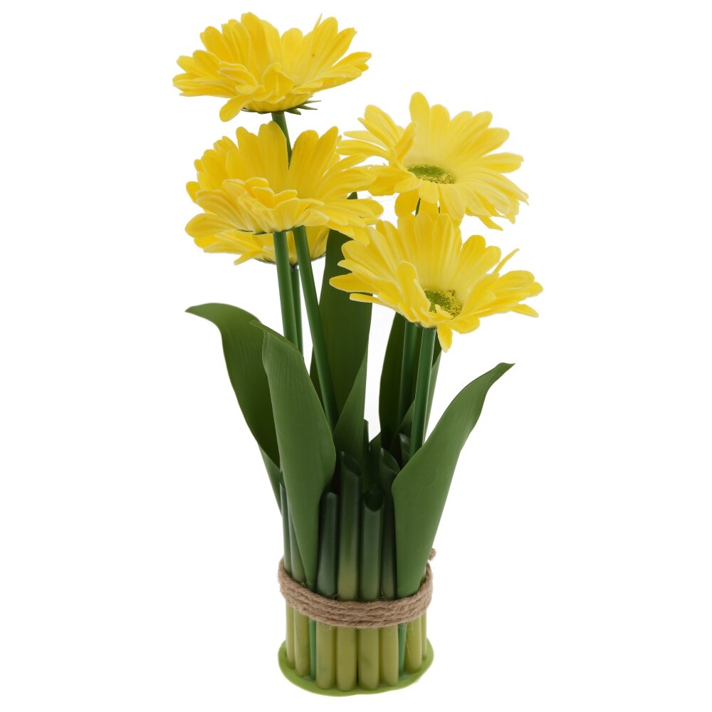 Искусственная цветочная композиция «Гербера» — изящный акцент для любого интерьера. Нежно-желтые соцветия с проработанными лепестками и естественной серединкой смотрятся как живые и создают ощущение свежести круглый год. Плотные зелёные листья и стебли гармонично собраны в оригинальную «вазочку» из имитации зелёных стеблей, перетянутых декоративным джутовым шнуром. Композиция компактна, не требует ухода, полива и особых условий освещения, не выцветает и не осыпается. Идеально подойдёт для оформления гостиной, спальни, офиса, кофейни, а также станет приятным подарком тем, кто любит цветы, но не имеет возможности ухаживать за живыми растениями.