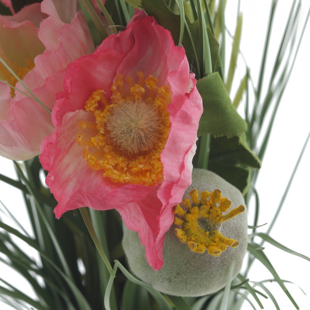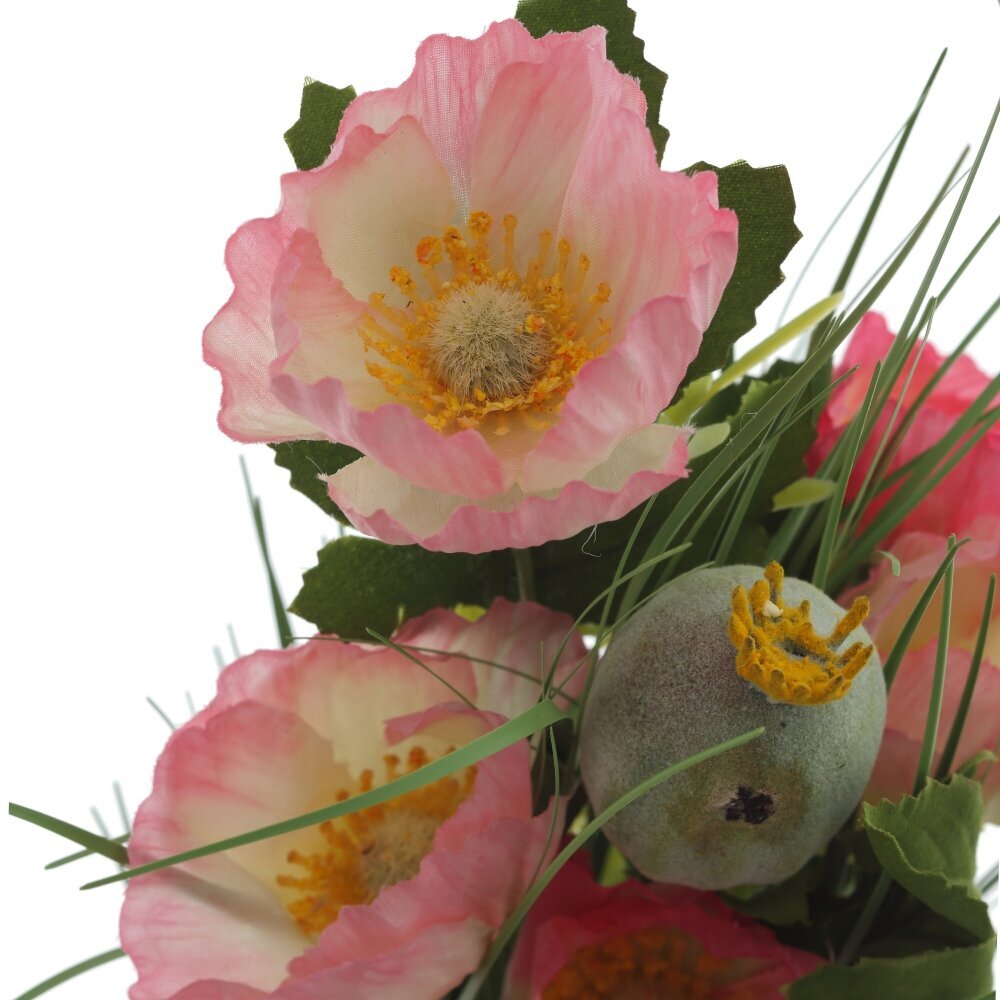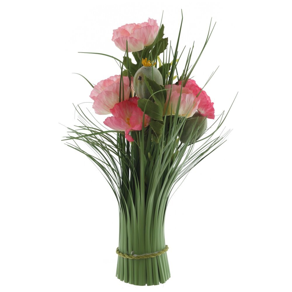 Искусственная композиция напоминает лёгкий полевой букет: плотный пучок длинных узких травинок собран у основания тонким плетёным жгутом. Сквозь зелёные стебли поднимаются несколько распустившихся цветов нежно?розового оттенка с более насыщённым краем лепестков и тёплой жёлтой сердцевиной. Видны матовые зелёные коробочки, усиливающие натуральный эффект и объём. Лепестки тонкие, слегка гофрированные, создают воздушность, а вертикальная форма делает букет стройным и аккуратным. Такая композиция не требует ухода, не выцветает, хорошо смотрится в узкой вазе на столе, подоконнике или полке, добавляя интерьеру свежесть и мягкий эко?акцент в стиле минимализм или сканди.