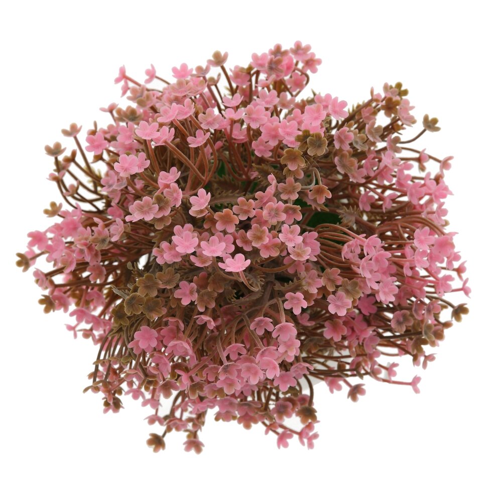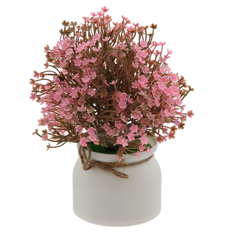 Нежная цветочная искусственная композиция в компактном белом кашпо станет стильным акцентом в интерьере дома или офиса. Пышный кустик с изящными розово?сиреневыми цветочками и тонкими коричневыми веточками выглядит реалистично и не требует ухода: не нужно поливать, подрезать или подбирать освещение. Матовые лепестки и фактурная зелень гармонично сочетаются с лаконичной белой вазочкой, украшенной декоративным шпагатом. Композиция идеально подходит для украшения рабочего стола, подоконника, полки, прикроватной тумбы, а также станет приятным и универсальным подарком.