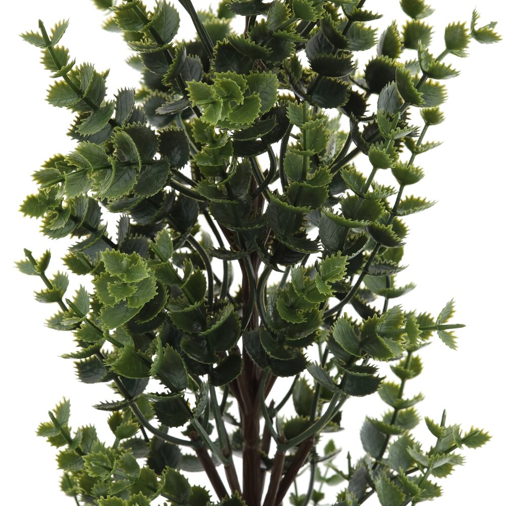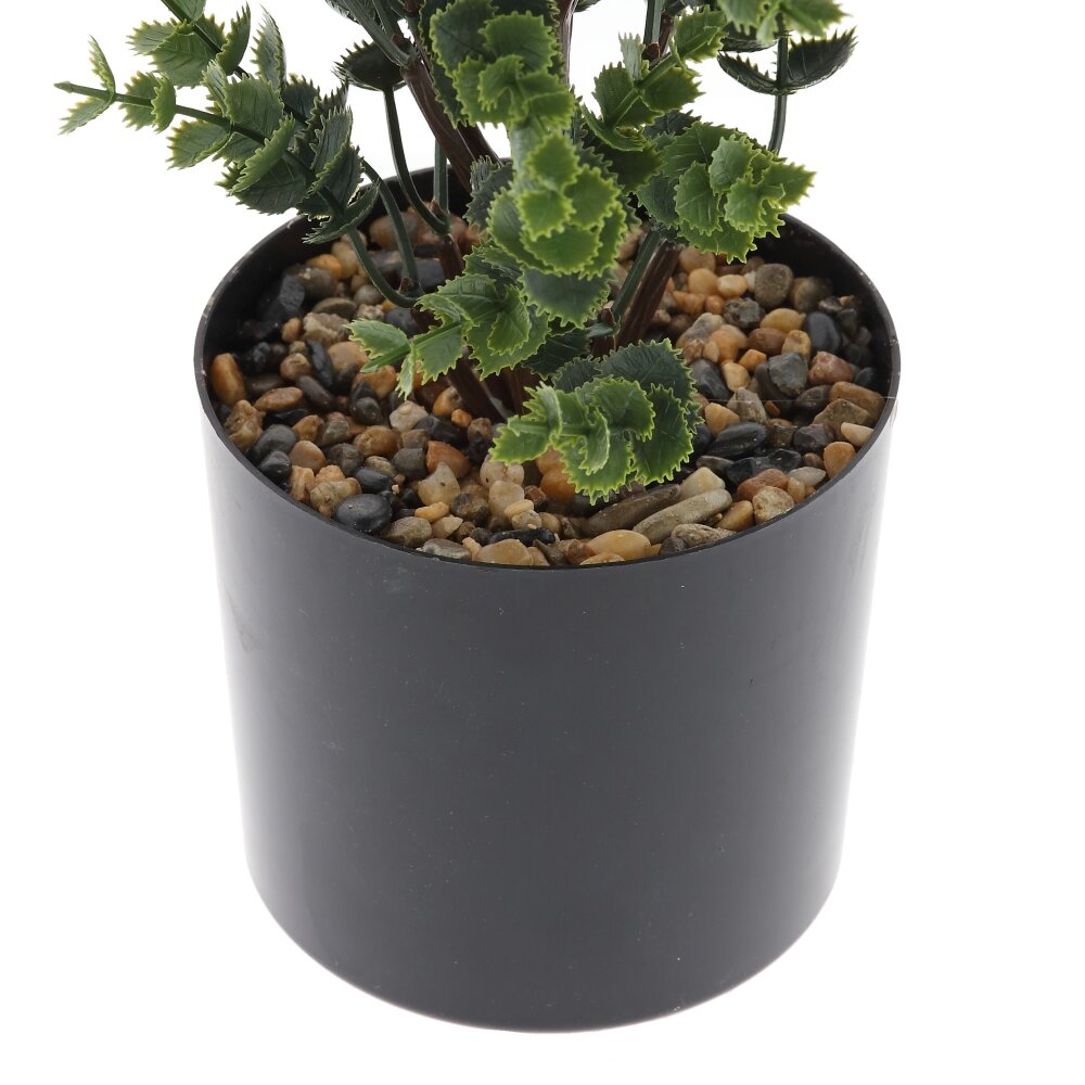 Стильная искусственная цветочная композиция в виде стройного декоративного кустарника в чёрном горшке станет ярким акцентом в любом интерьере. Плотная крона с множеством мелких зелёных листьев и реалистично выполненные ветви создают эффект живого растения, при этом не требуют полива, света и особого ухода. Горшок дополнен декоративными камешками, что придаёт композиции завершённый и аккуратный вид. Идеально подходит для офиса, дома, приёмной, кафе или салона красоты, помогает быстро освежить пространство и добавить уюта. Растение не выгорает на солнце, легко очищается от пыли и долго сохраняет первоначальный вид.