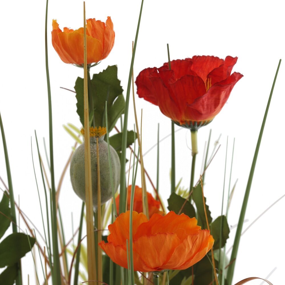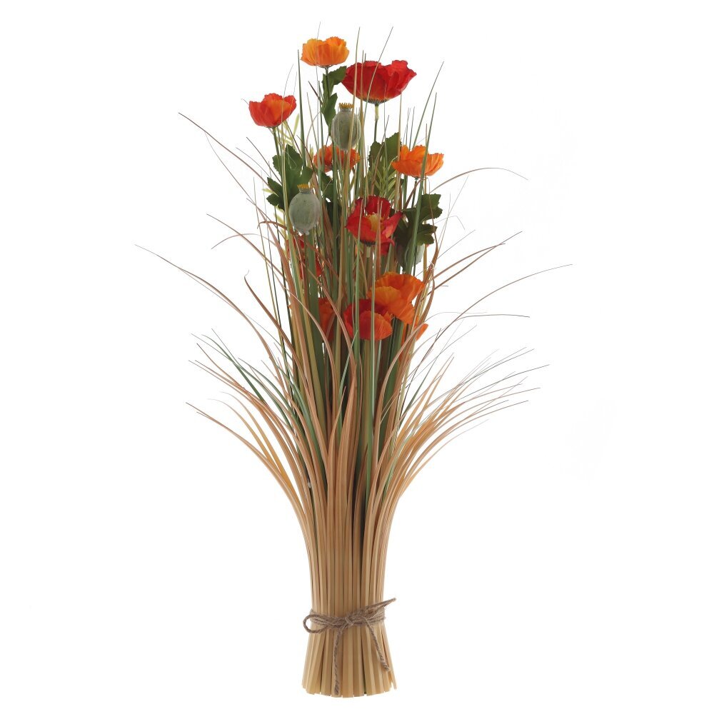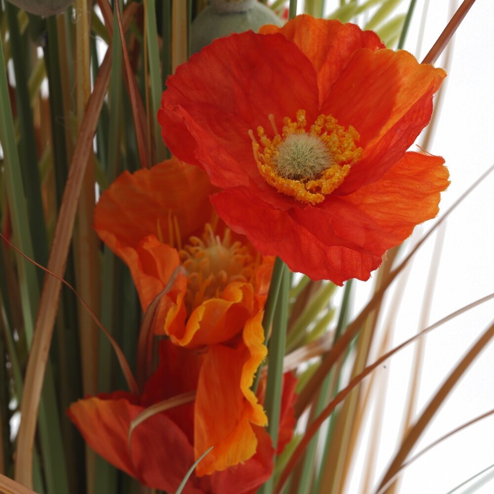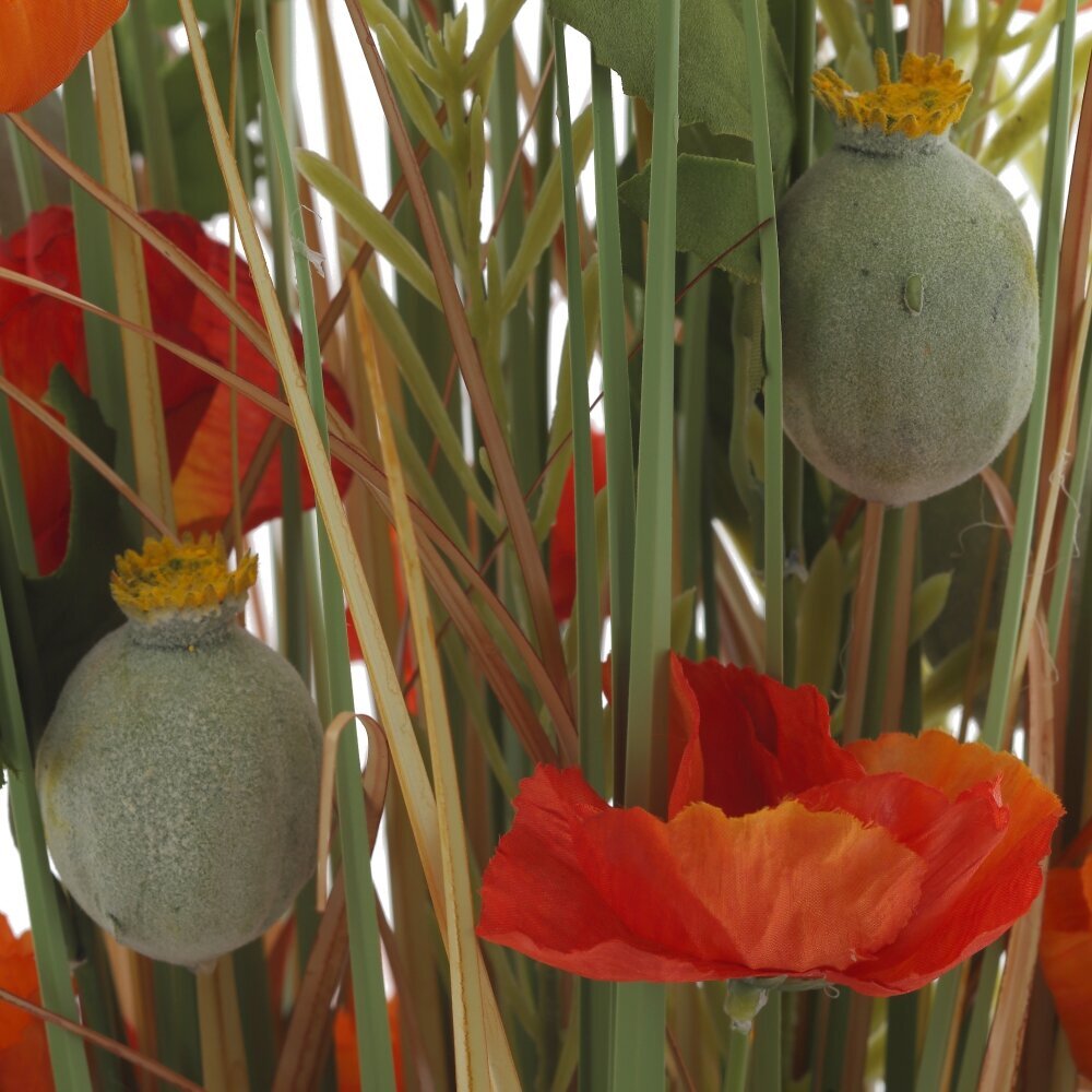 Перед вами декоративная искусственная композиция в деревенском стиле. Пучок светлой сухой травы аккуратно собран и перевязан бечёвкой у основания, образуя устойчивую «ножку». Из середины поднимаются тонкие зелёные стебли и узкие листья, среди которых раскрываются яркие цветы, напоминающие полевые маки: огненно?красные и оранжевые лепестки, несколько бутонов и коробочки с семенами. Сочетание тёплых оттенков и природной фактуры создаёт ощущение летнего луга и добавляет в интерьер мягкое осеннее настроение. Композиция не требует полива и ухода, хорошо смотрится на комоде, подоконнике или в прихожей, легко вписывается в эко?интерьер, кантри и минимализм, служит долговечным акцентом и дарит ощущение уюта.