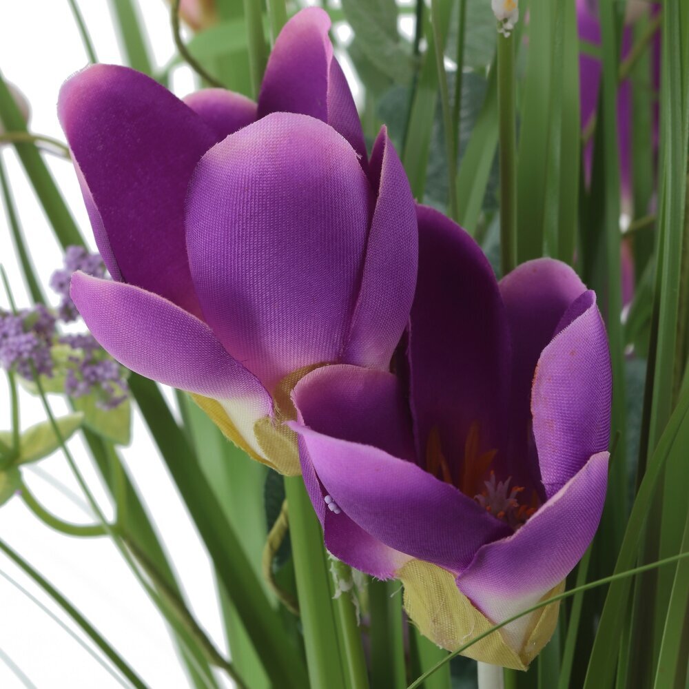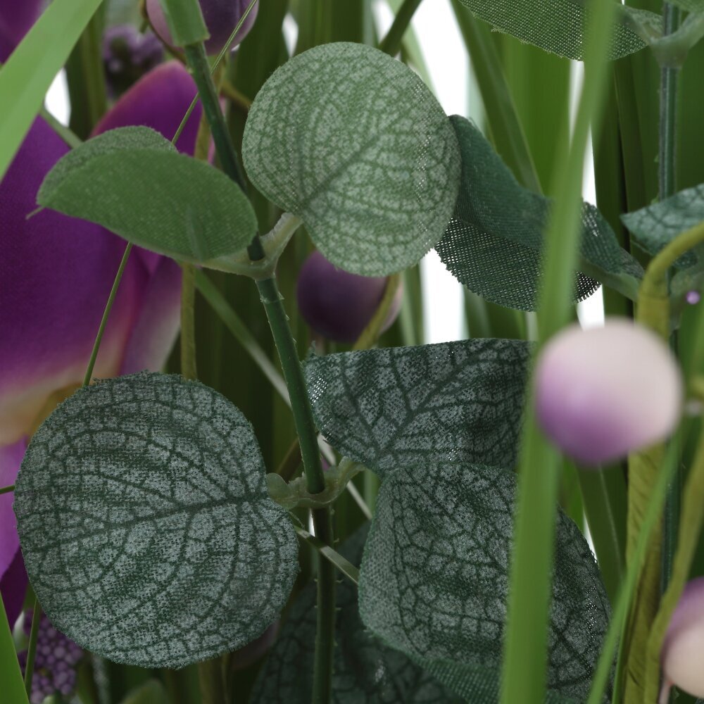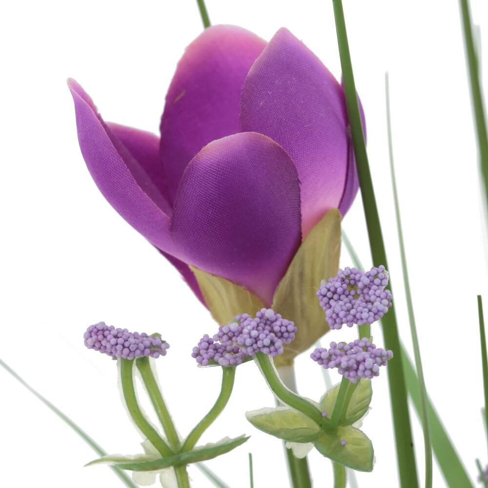 Искусственная цветочная композиция в виде пучка декоративной зелени с яркими фиолетово-лиловыми бутончиками. Длинные узкие листья собраны у основания в аккуратный жгут, что придаёт букету стройный силуэт и завершённый вид. Нежные цветки с мягкими желтоватыми сердцевинами и редкими светлыми ягодками-акцентами создают ощущение живого лугового букета. Композиция выглядит воздушно и свежо, легко вписывается в современный интерьер, офис или зону отдыха, не требует ухода и долго сохраняет насыщенность красок. Её удобно ставить в вазу или использовать как самостоятельный декор на полке, подоконнике или прикроватной тумбе.