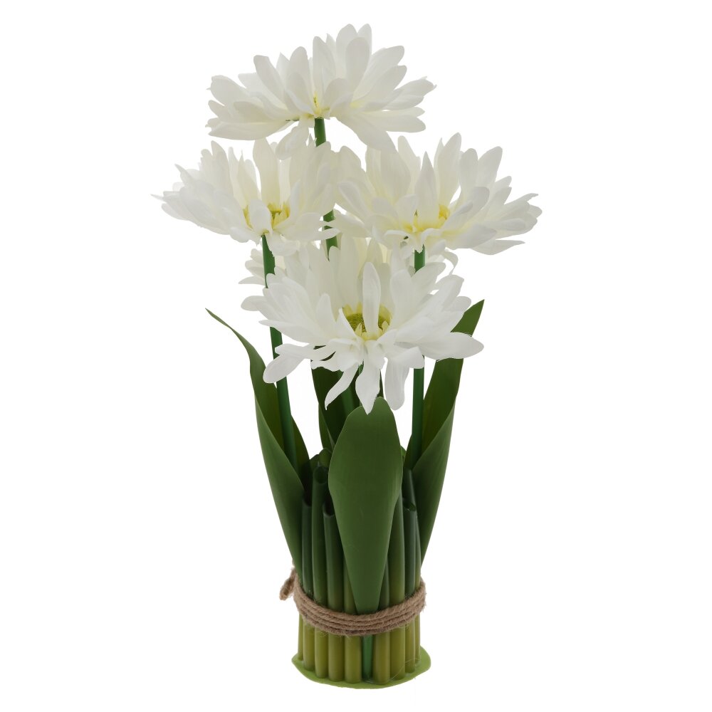 Искусственная цветочная композиция «Ромашки» — изящный акцент для любого интерьера. Нежно-белые соцветия с проработанными лепестками и естественной серединкой смотрятся как живые и создают ощущение свежести круглый год. Плотные зелёные листья и стебли гармонично собраны в оригинальную «вазочку» из имитации зелёных стеблей, перетянутых декоративным джутовым шнуром. Композиция компактна, не требует ухода, полива и особых условий освещения, не выцветает и не осыпается. Идеально подойдёт для оформления гостиной, спальни, офиса, кофейни, а также станет приятным подарком тем, кто любит цветы, но не имеет возможности ухаживать за живыми растениями.
