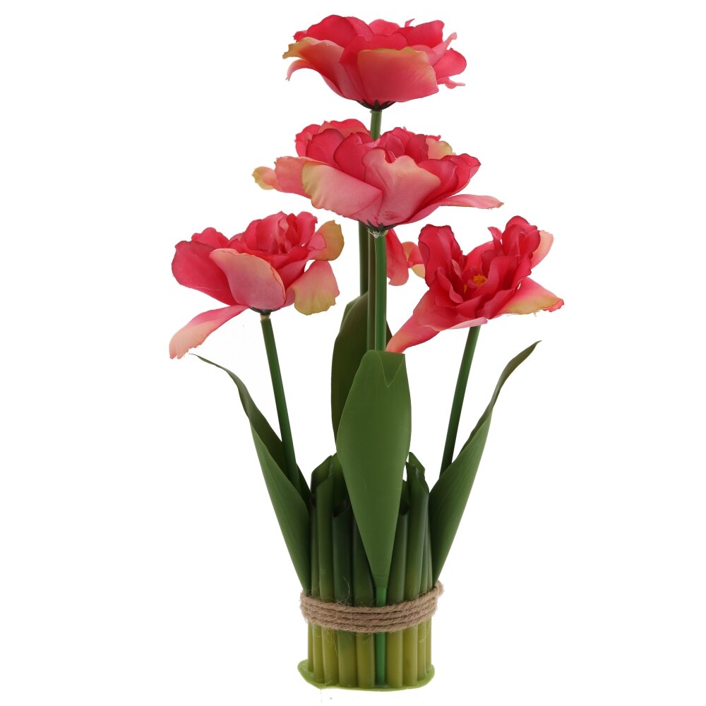 Искусственная цветочная композиция «Роза» – изящное украшение для дома и офиса, которое будет радовать яркими красками круглый год. Объёмные бутоны насыщенного розового цвета с плавным переходом к светлым краям лепестков выглядят максимально естественно и создают эффект живого букета. Плотные зелёные листья и стебли дополняют композицию и выгодно подчёркивают красоту цветов. Основание выполнено в виде пучка декоративных стеблей, перевязанных бечёвкой, что придаёт изделию стильный и современный вид. Композиция компактна, устойчива и не требует ухода: её не нужно поливать, подрезать или ставить на свет. Такой букет идеально подойдёт для украшения гостиной, спальни, кухни, приёмной или рабочего стола, а также станет приятным и практичным подарком для тех, кто ценит уют и красоту без лишних хлопот.