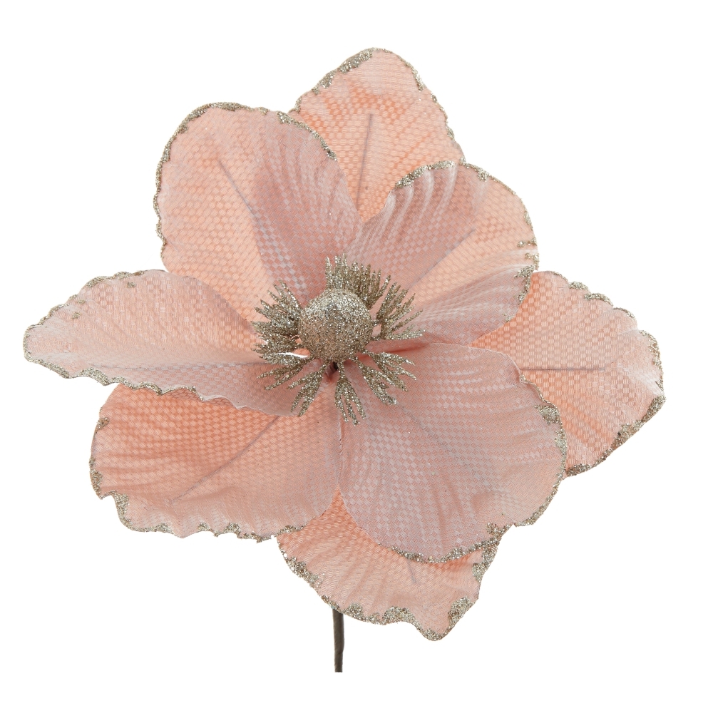 С ролью украшения новогодней ели прекрасно справится этот искусственный цветок. Магнолия розового цвета. Благородность цветка подчеркивают золотые блестки по краям и в середине.
