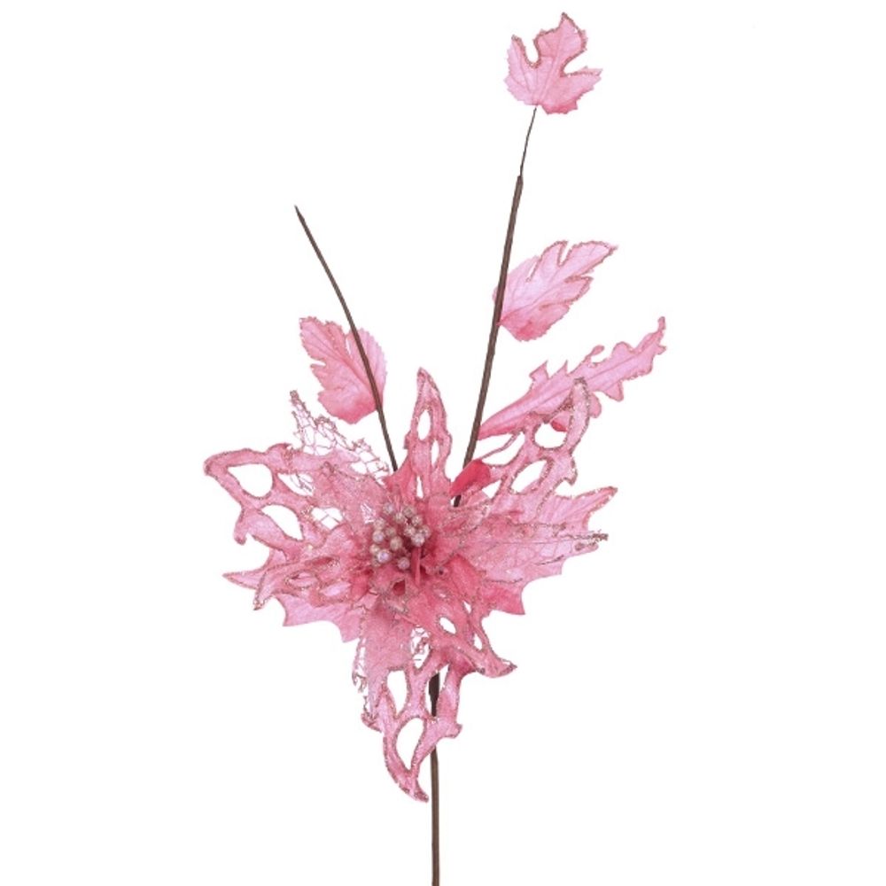 С ролью украшения новогодней ели прекрасно справится этот искусственный цветок. Пуансеттия розового цвета. Благородность цветка подчеркивают блестки по краям и в середине.
