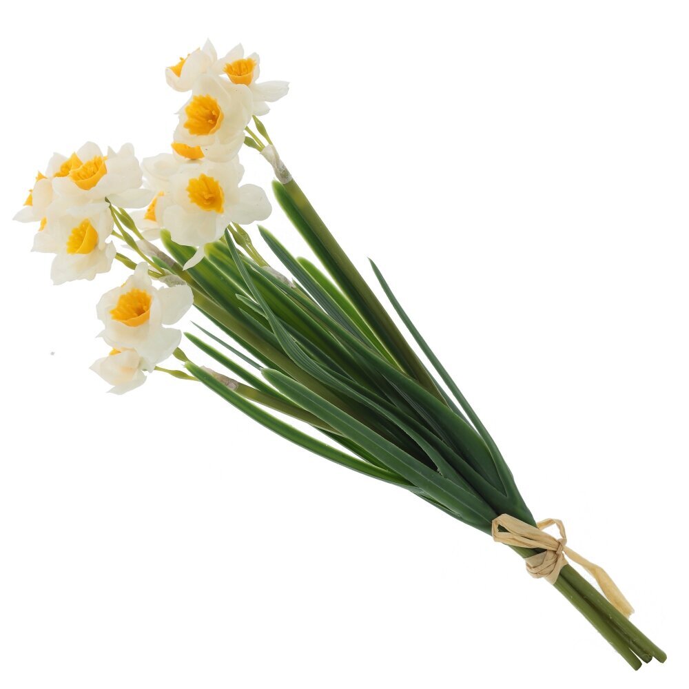 Искусственные цветы «Букет Нарциссов» – изящная композиция с реалистичными соцветиями. Молочно?белые лепестки и солнечно?желтая коронка передают свежесть весны, а длинные узкие листья дополняют естественный вид. Бутоны и стебли изготовлены из качественных полимерных материалов, устойчивых к выцветанию и деформации. Гибкие стебли легко фиксируются, собраны аккуратной перевязью. Букет отлично смотрится в вазе, подойдет для оформления интерьеров, фотозон, витрин и праздничных композиций. Не требует полива и особого ухода — достаточно периодически протирать пыль. Сохраняет форму и цвет многие сезоны.