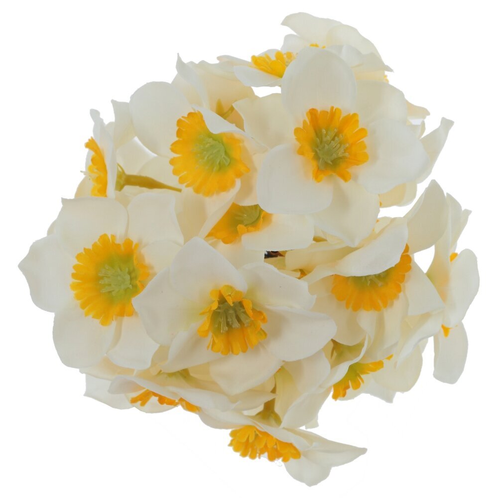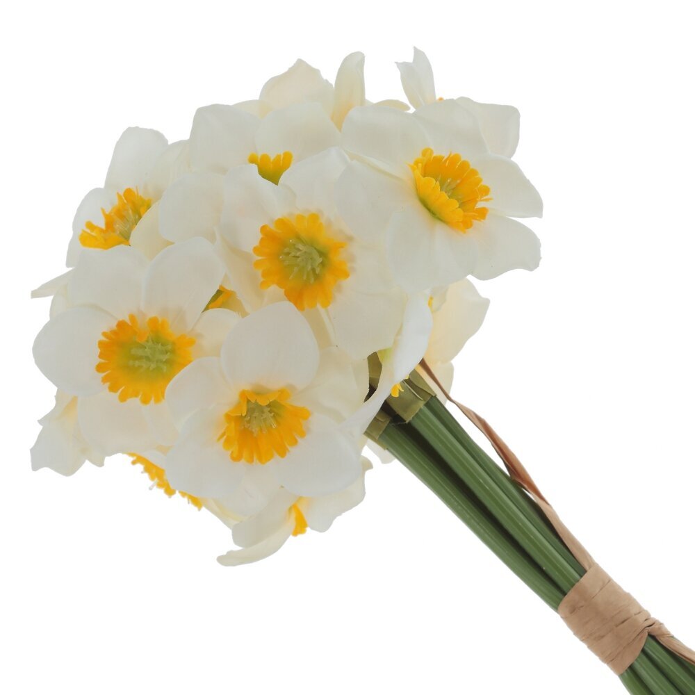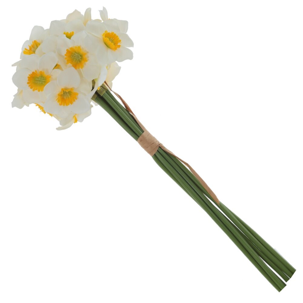 Искусственный букет нарциссов – это прекрасное украшение интерьера, которое не требует ухода, но сохраняет свою красоту долгие годы. Цветы выполнены из полимерных и текстильных материалов, обеспечивая их реалистичный внешний вид и приятную на ощупь текстуру. Металлический каркас внутри стеблей делает их устойчивыми и позволяет придавать им нужную форму. Белоснежные лепестки с желтыми сердцевинами выглядят изящно и естественно, создавая атмосферу свежести и уюта. Букет идеально подойдет для декора дома, офиса, фотосессий или праздничного оформления.