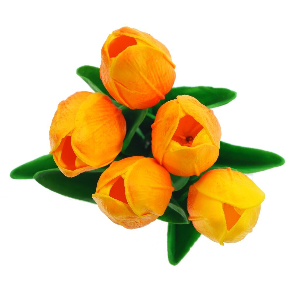 Искусственный букет тюльпанов выполнен из высококачественных полимерных материалов, что делает его практически неотличимым от живых цветов. Нежные лепестки с плавными переходами оттенков передают естественную текстуру и насыщенность окраса, а упругий стебель с реалистичными листьями обеспечивает долговечность и эстетичность композиции. Благодаря технологии Real Touch на ощупь цветы напоминают натуральные, создавая эффект свежесрезанных растений. Такой букет станет прекрасным украшением интерьера, подарком на праздник или элементом декора для фотосессий. Он не требует ухода, сохраняет свой безупречный вид в любое время года и идеально вписывается в любой стиль оформления помещения.