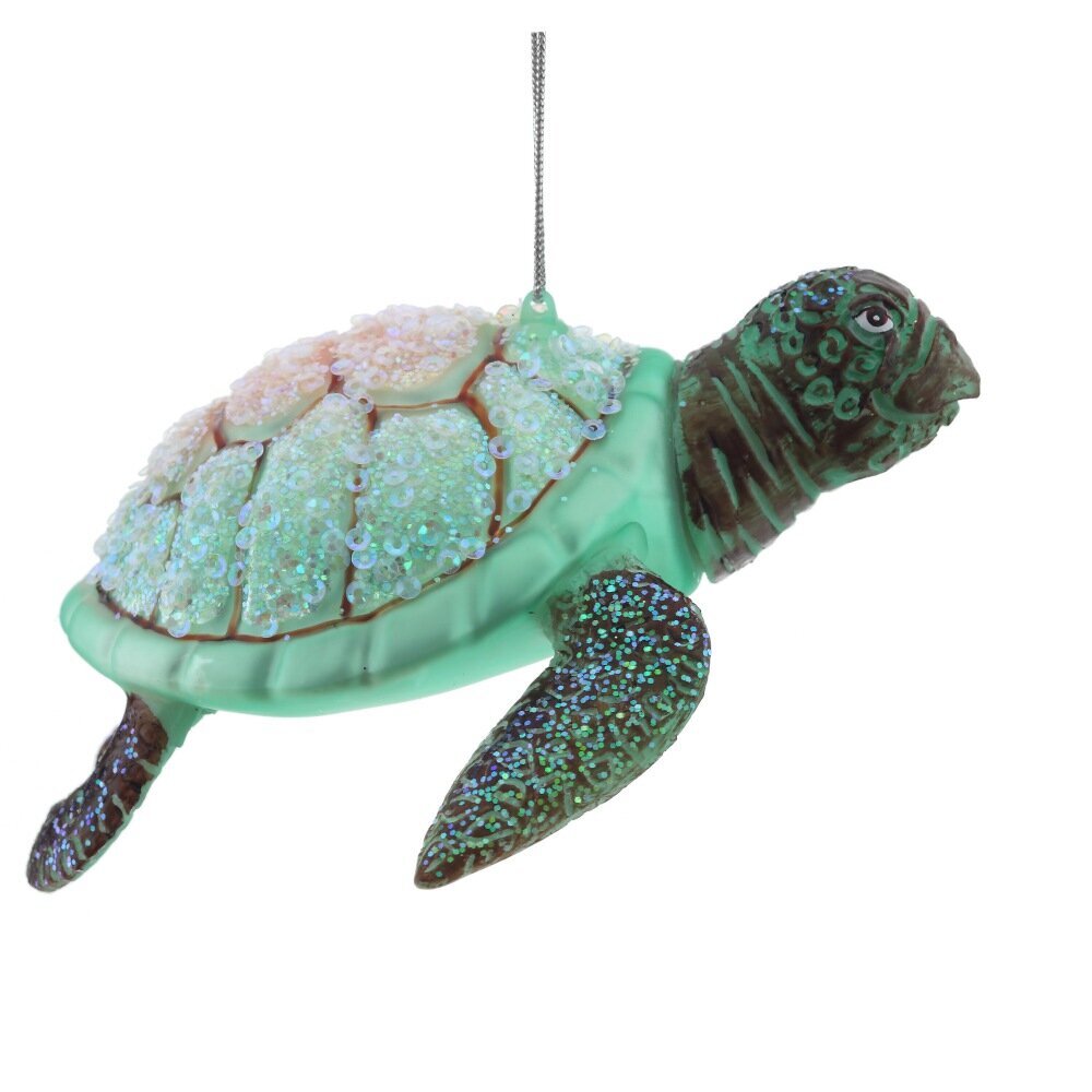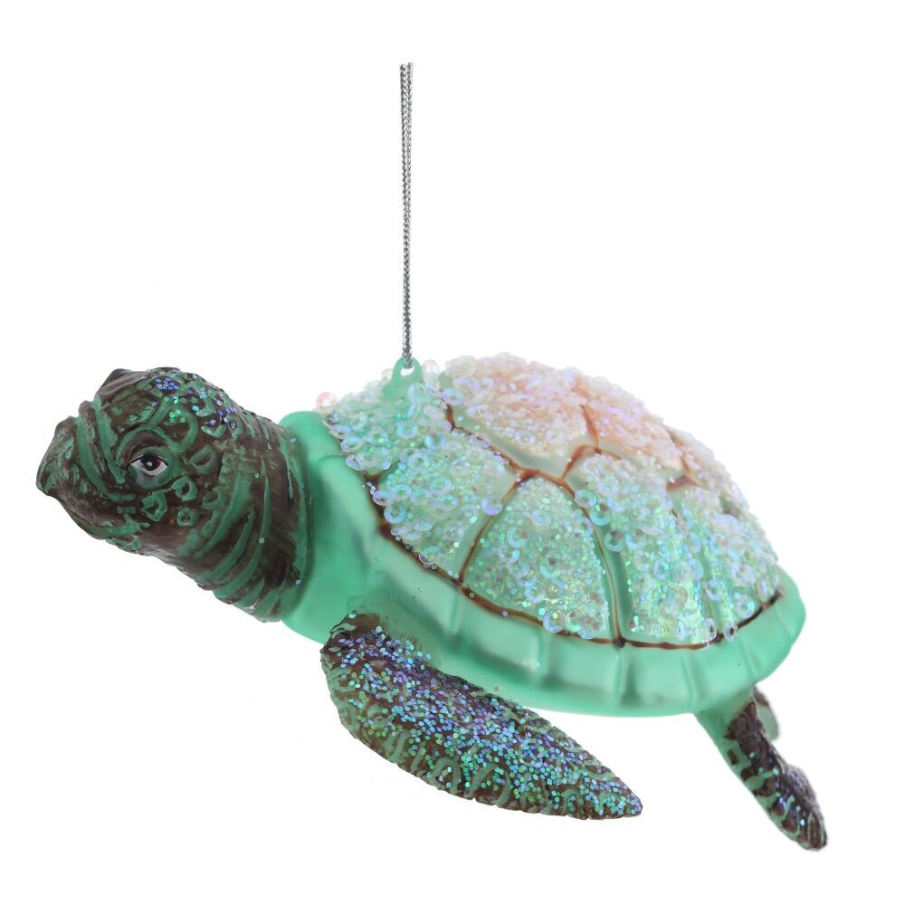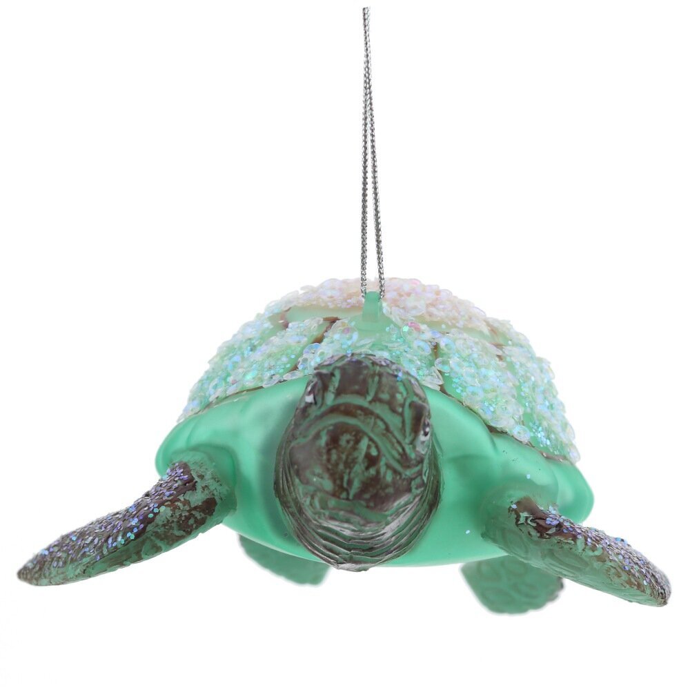Украшение новогоднее "Черепаха" - это изысканное произведение искусства, выполненное из стекла и полимерных материалов. Детали головы и плавников проработаны с высокой детализацией, что придает этой игрушке особый шарм. Бирюзовый панцирь украшен пайетками и блестками, которые создают эффект сияния и привлекают внимание. Эта великолепная елочная игрушка станет ярким украшением праздничной елки и точно притянет к себе восторженные взгляды.