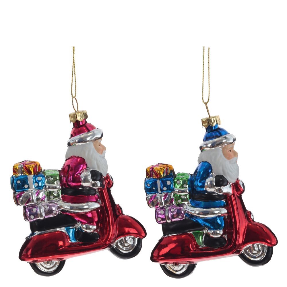 Представлено в двух вариантах цвета: Дед Мороз в синем костюме на красном мопеде, и в розовом костюме на красном мопеде.