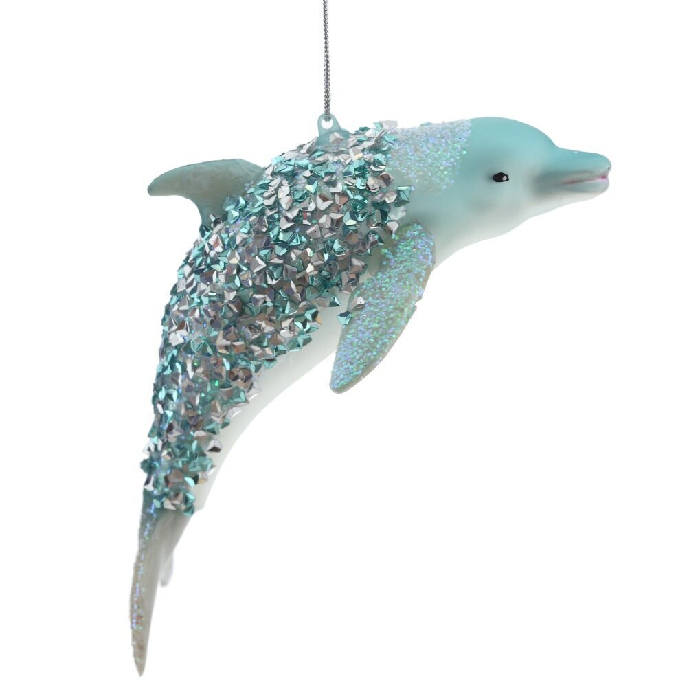 Комбинированная елочная игрушка в виде морского дельфина в бирюзовом цвете украшена блестящими стразами в цвет. Тело дельфина выполнено из стекла, а плавники и хвост - из полимерного материала. Эта игрушка станет отличным дополнением к новогодним украшениям, придавая уют и праздничный дух вашему дому.