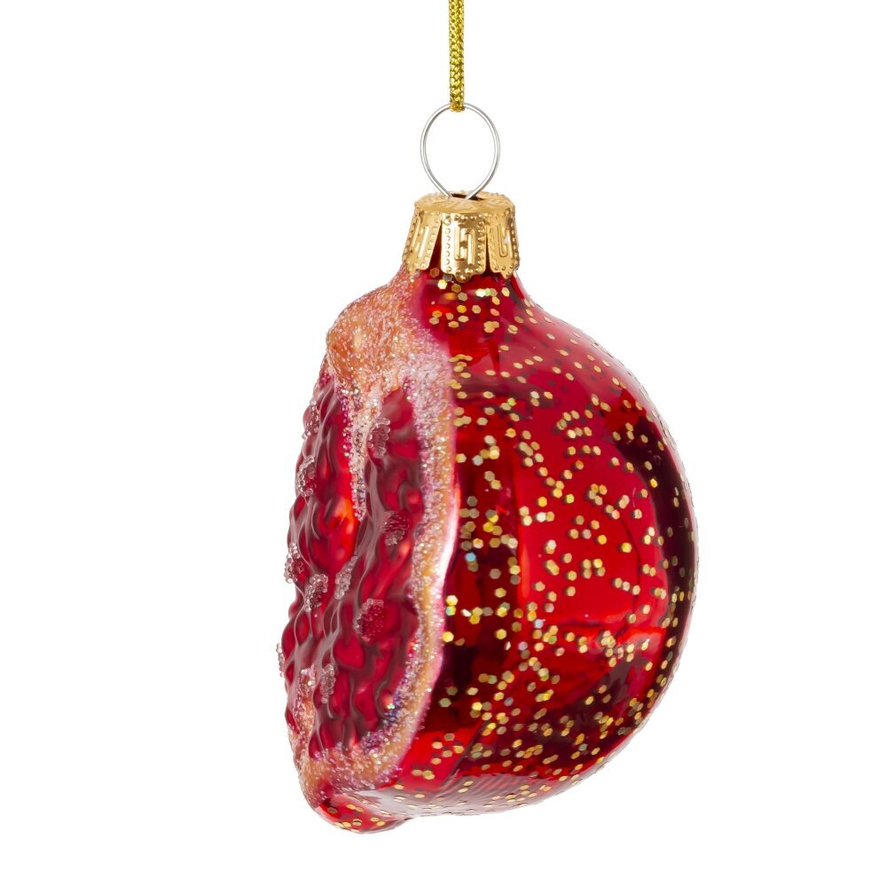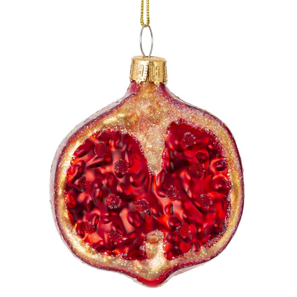 Елочное украшение из стекла в виде граната — это изысканный и символичный элемент новогоднего декора, олицетворяющий изобилие, плодородие и благополучие. Выполненное вручную из тонкого стекла, украшение отличается насыщенным бордовым или тёмно-красным цветом с глянцевым блеском, который придаёт ему реалистичный и праздничный вид. Форма граната тщательно проработана: рельефная поверхность напоминает кожуру настоящего плода, а верхушка оформлена в виде декоративной короны с золотистыми или серебристыми акцентами. Некоторые модели могут быть стилизованы с открытым «надрезом», сквозь который виднеются стеклянные зёрна — сверкающие капельки, напоминающие рубины. Такое украшение не только украсит ёлку, но и станет символом процветания и удачи в новом году.