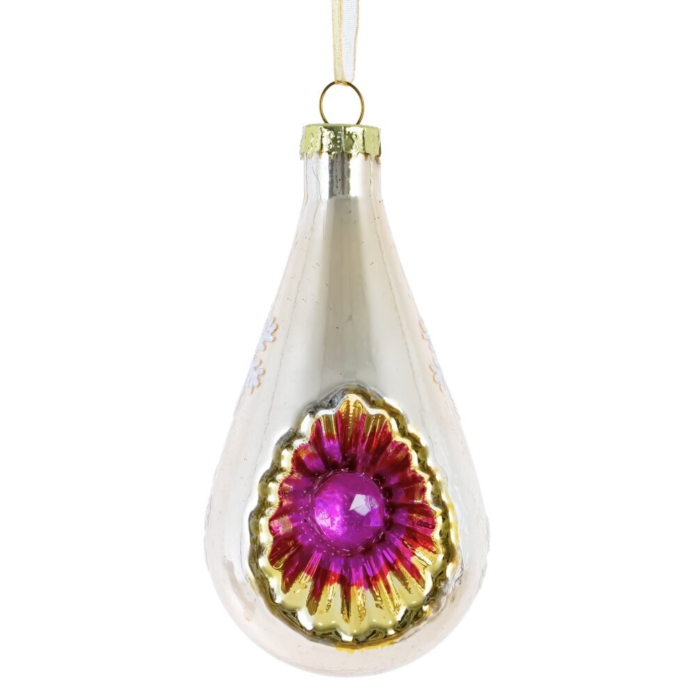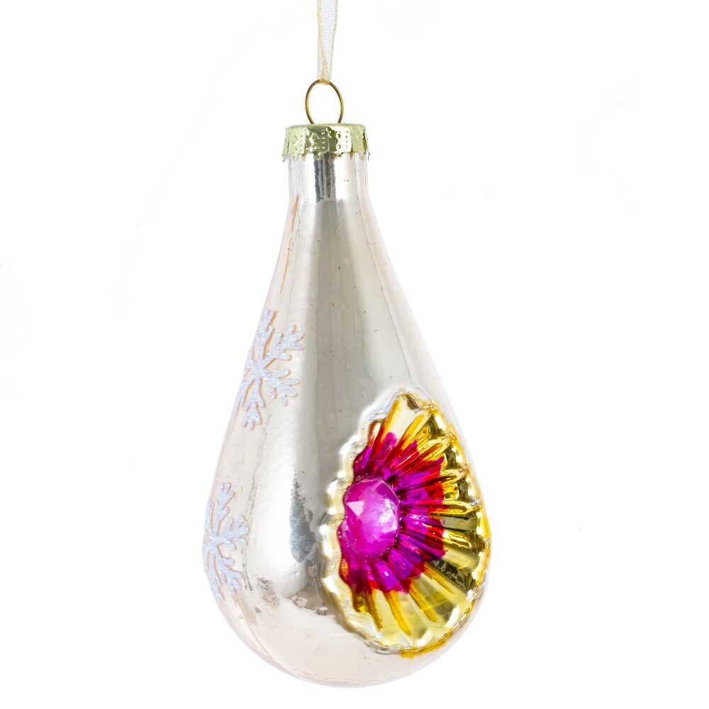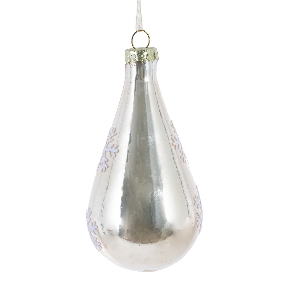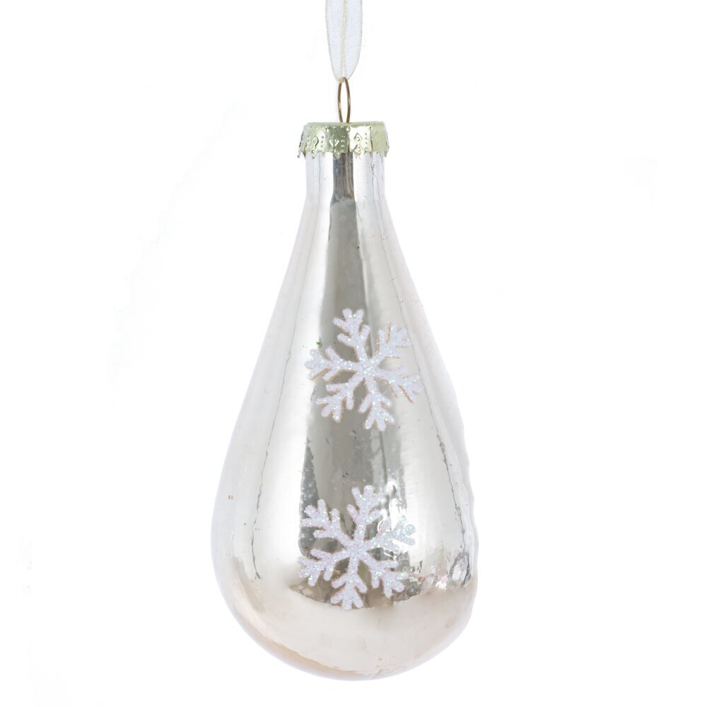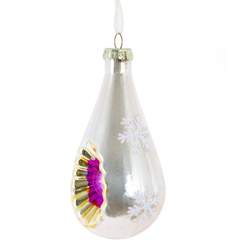 Украшение новогоднее "Капля", изготовлено из стекла. Необычный шар-фонарик в виде капли с перламутровым блеском ,рисунком в виде снежинок и стразом подойдет к любой традиционной новогодней коллекции шаров для украшения елки.