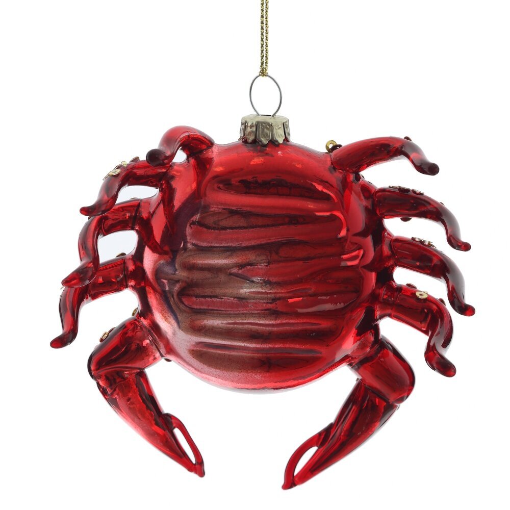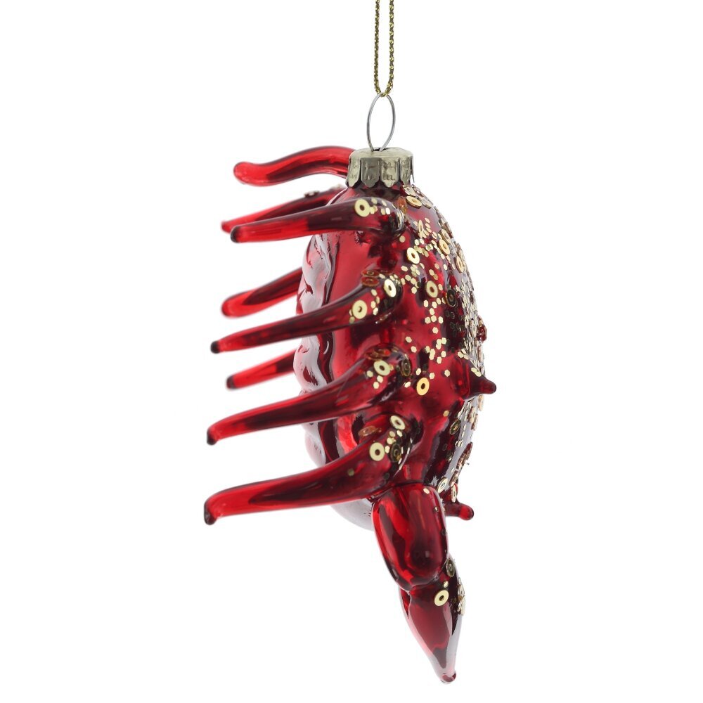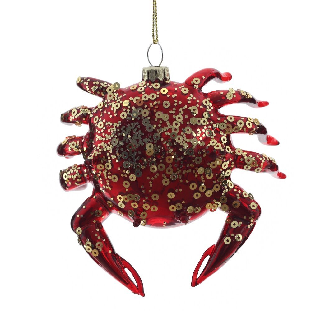 Яркий стеклянный краб - необычная елочная игрушка на морскую тему. Искрящиеся золотые пайетки придают красному крабу особый блеск, словно он создан для волшебной новогодней атмосферы. Этот морской обитатель точно станет ярким акцентом на вашей праздничной елке, привнося в дом ощущение праздника и морского бриза.