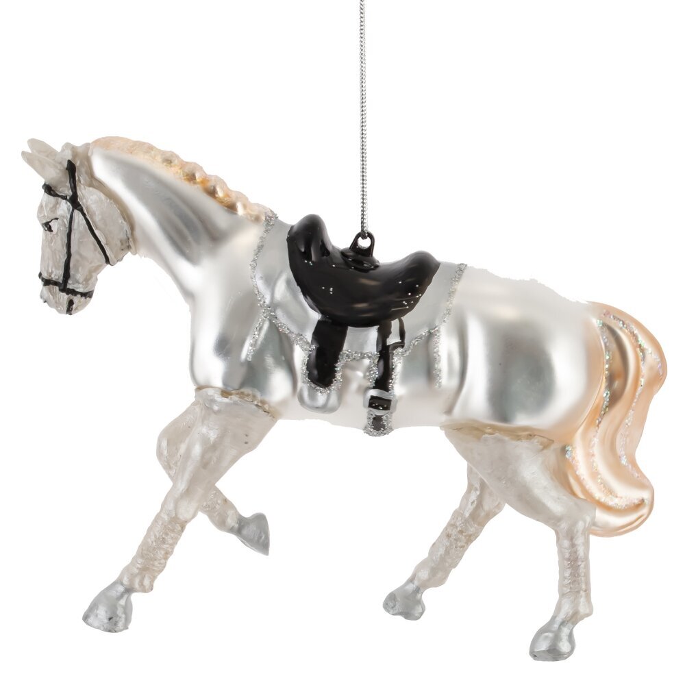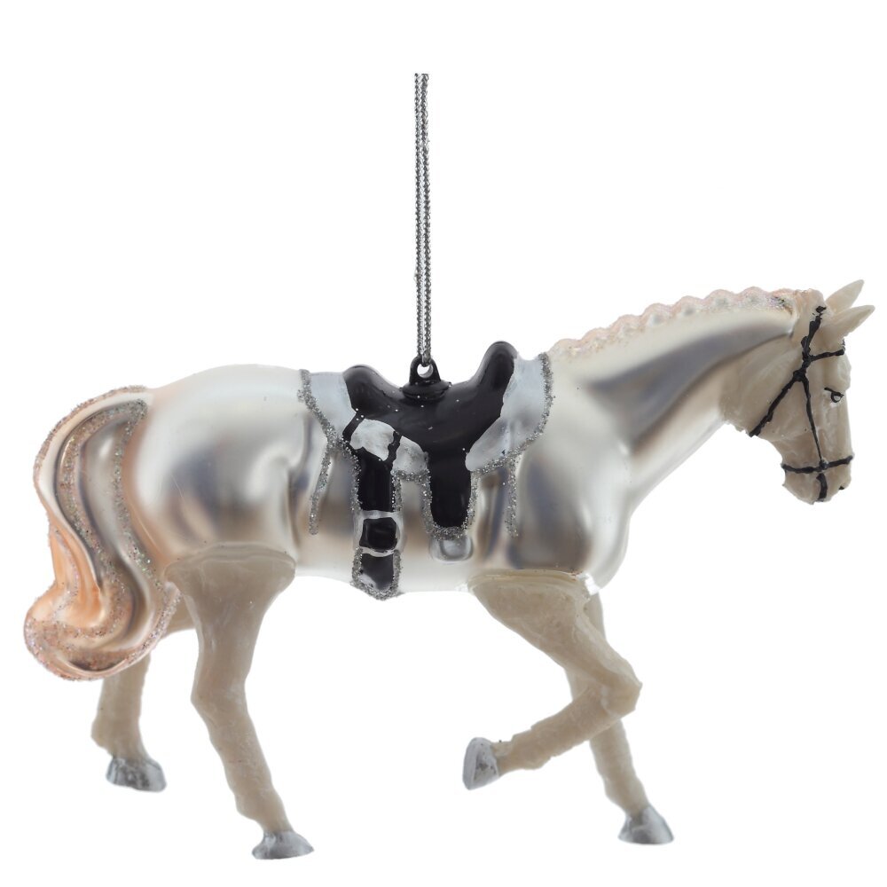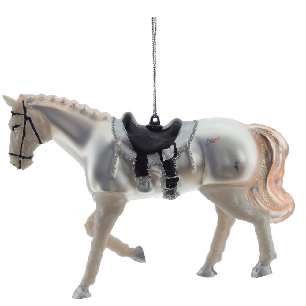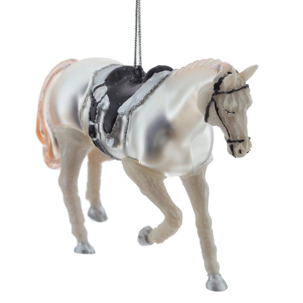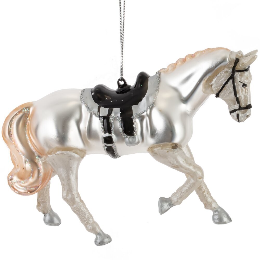 Елочное украшение из стекла в виде лошади — изящный и элегантный элемент праздничного декора. Тонкая проработка деталей, блестящая поверхность и утончённый силуэт придают изделию особый шарм. Такое украшение станет красивым акцентом на новогодней ёлке и добавит в интерьер нотку грации и волшебства.